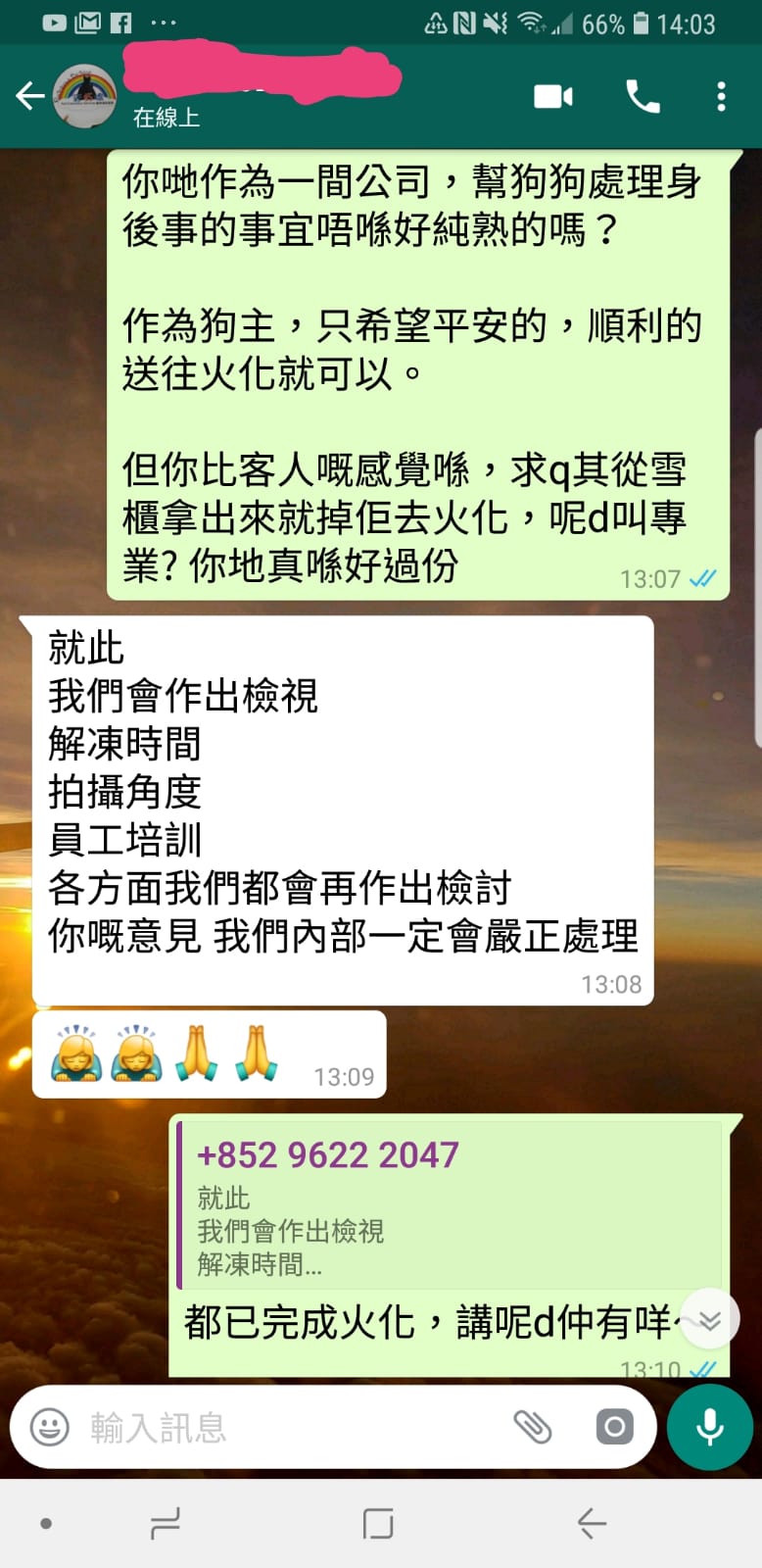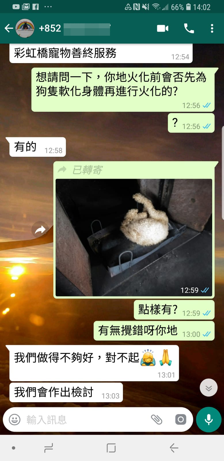 她當即在whatsapp質問對方為何沒有軟化狗狗身體便火化,對方即道歉說「我們做得不夠好」,又指會檢視解凍時間、拍攝角度、員工培訓等。