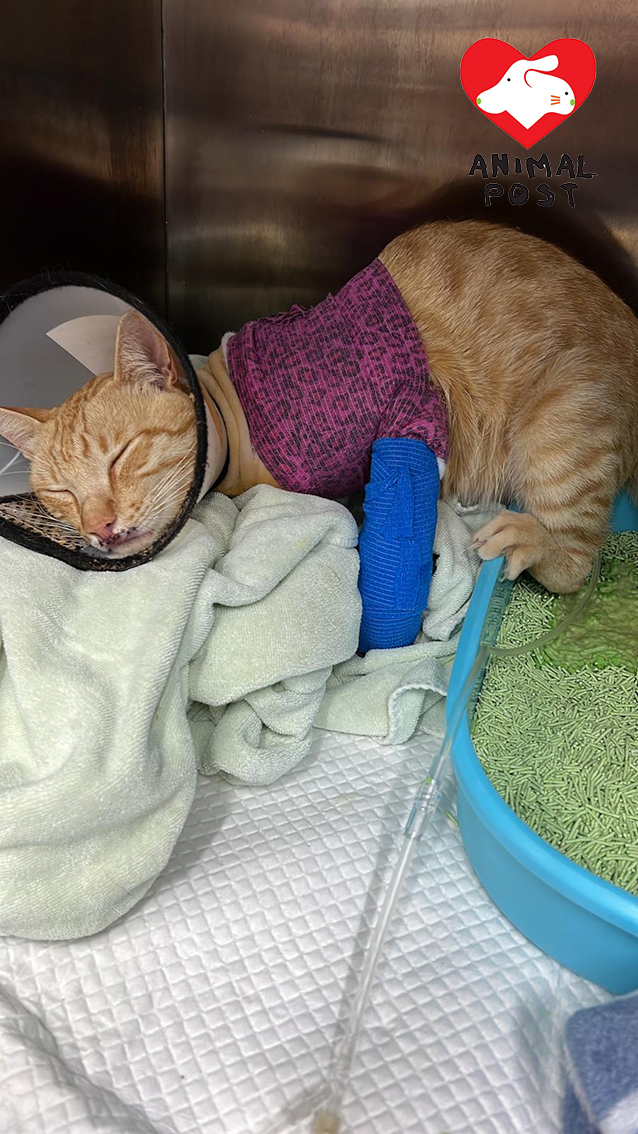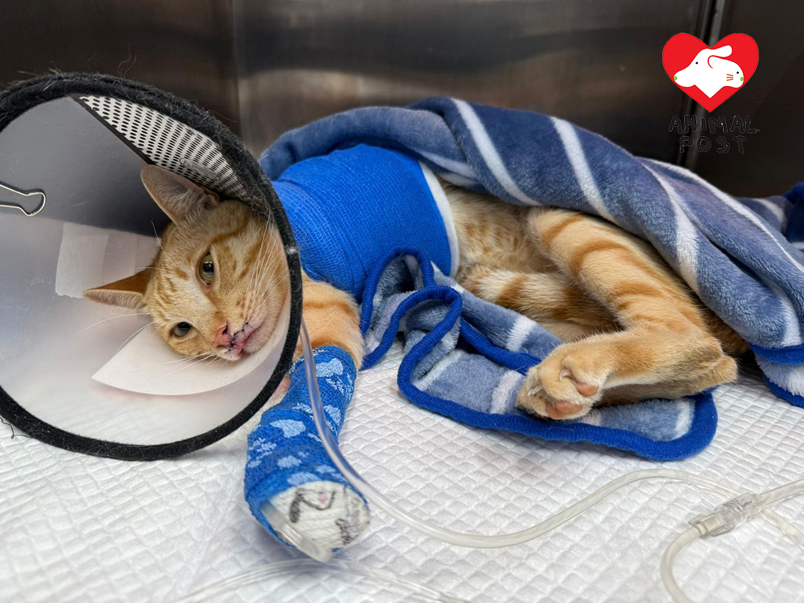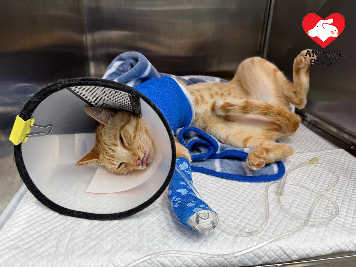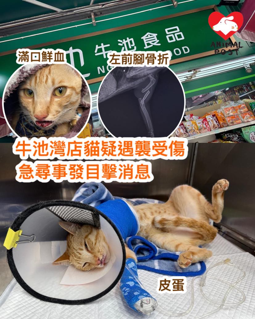 【動物專訊】牛池灣發生懷疑虐待動物案件,一隻凍肉舖店貓「皮蛋」於5月28日早上7時許負傷躺在後巷,東主Ken將他抱回店時,發現貓貓左前腳骨折,而且嘴唇爆裂滿口鮮血,十分痛苦。他即時報警,並將皮蛋帶到獸醫診所進行駁骨手術,可憐的皮蛋足足住了6日醫院,6月2日出院回店舖休養。義工范太公開事件,希望尋找到目擊事發經過的市民,為皮蛋討回公道。