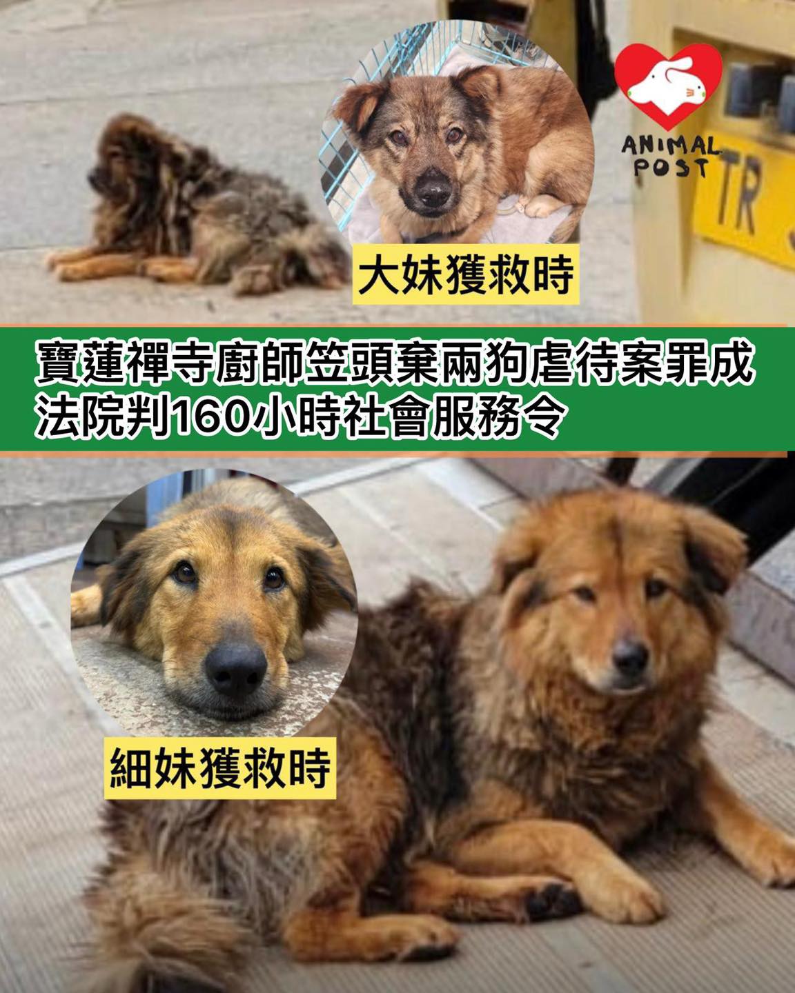 【動物專訊】居於大嶼山寶蓮禪寺狗狗「大妹」和「細妹」去年8月被65歲廚師伍星耀以袋笠頭遺棄,幸在義工和熱心市民全力搜救下,兩狗均平安尋回。伍星耀被控3項殘酷對待動物罪成,今日西九龍裁判法院署理主任裁判官鄭念慈判處伍星耀160小時社會服務令。