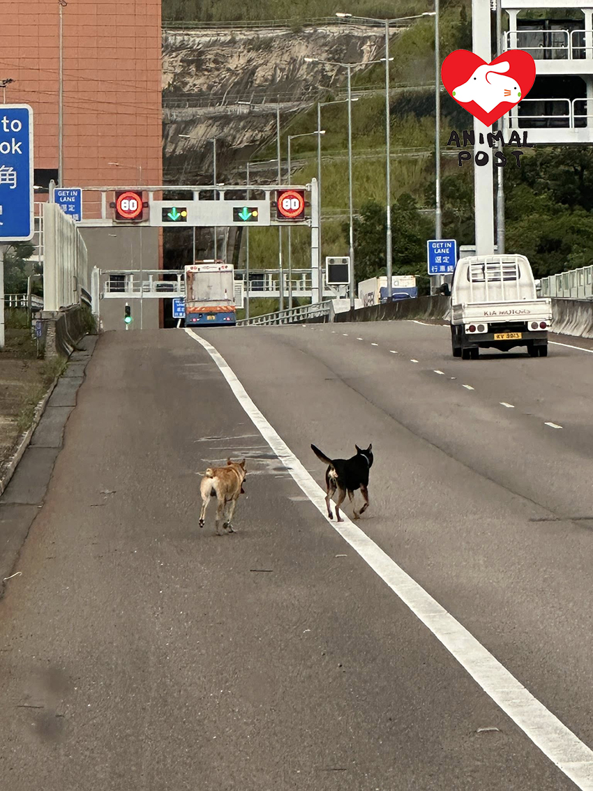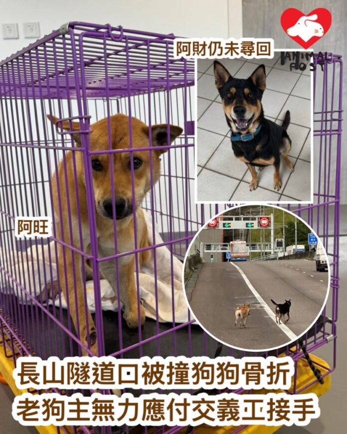 事緣昨日傍晚6時許有兩隻戴頸圈狗狗跑到北區長山隧道口,其中黃色狗狗阿旺慘被車撞傷,並由愛協救走,而另一隻黑色狗狗阿財則跑向禾徑山,然後不知所蹤。兩狗是由陳伯伯所養,昨日黃昏有人打開了村屋鐵閘,讓兩狗衝出門外。