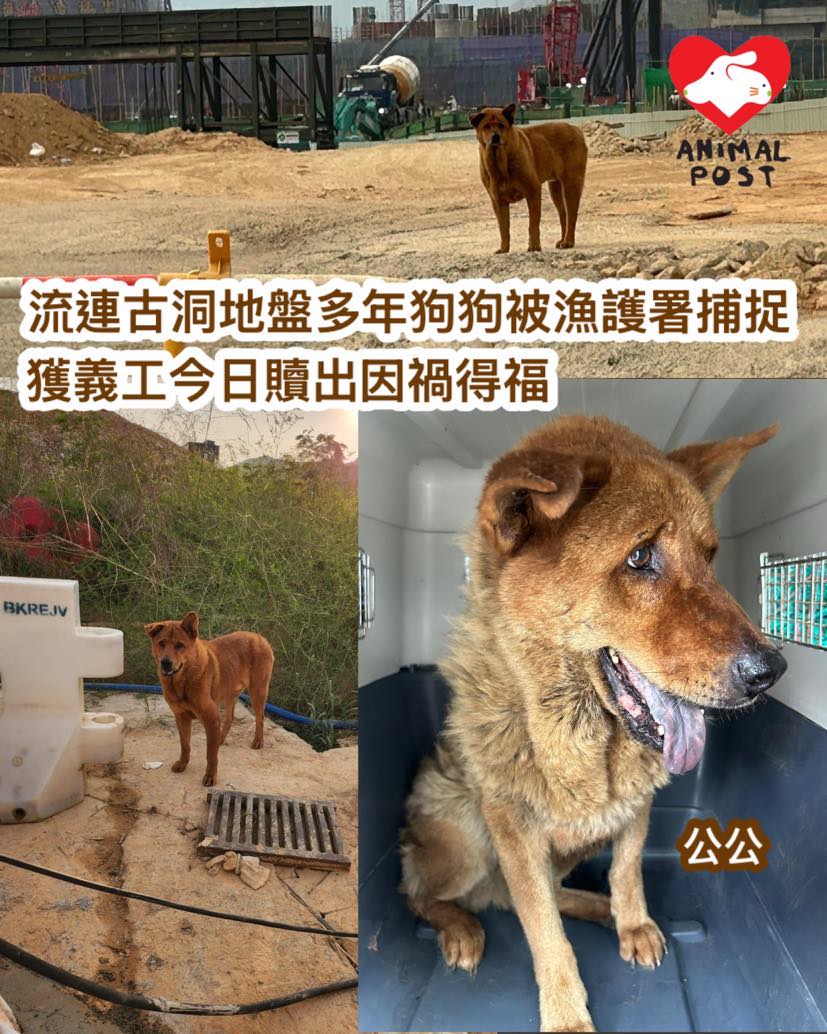 【動物專訊】新界東北重建下,很多昔日的村落變成廢墟和地盤,很多貓狗流離失所。過去在古洞馬草壟「志記鎅木廠」附近居住的社區狗媽媽「6B媽」於今年4月於地盤外慘被車撞死,而跟6B媽相熟的「公公」卻因禍得福,他在6月19日被漁護署捕捉,「520浪浪加油站」Bella在機緣巧合下得知此事,今日成功將公公從漁護署贖出,估計已12歲的公公終於可以不用在充滿危險的地盤朝不保夕,獲得有人照顧安享晚年的機會。