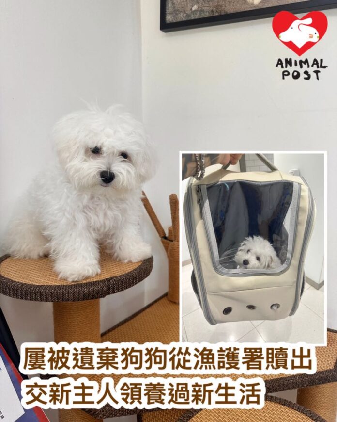 【動物專訊】本報日前報道不足1歲的摩天使「豆腐」被人連袋遺棄於觀塘APM殘廁,由愛護動物協會帶走並交漁護署,更揭女狗主不只一次遺棄該狗狗,不過狗狗最終有好消息。有熱心市民成功游說該女狗主放棄豆腐的撫養權,並改由該熱心市民當領養人,新主人今日從漁護署贖回狗狗,並將狗狗改名為「蛋白仔」,帶回家中過新生活。