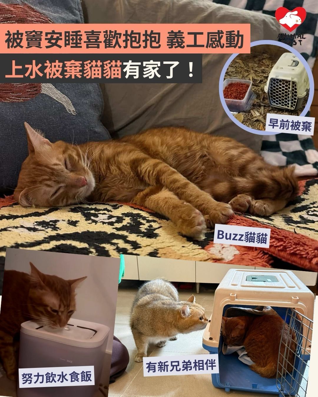 領養人Canace指自己跟黃貓特別有緣,「以前家中養的都是黃橙貓,早前家中的黃貓過身後,一直想再添新成員,這次剛好看到Buzz在尋家。」Canace家中有兩貓,她指Buzz初到貴境難免要跟兩隻貓貓「打招呼」,有點小衝突,一日過後,三貓已開始互相適應。