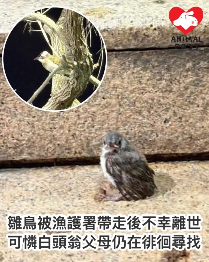 【動物專訊】長沙灣星匯居一隻白頭翁雛鳥日前因大雨毀巢而跌在地上,曾有熱心街坊建造了一個人工巢給他,惟雛鳥再次跌出巢外,屋苑管理處聯絡漁護署將雛鳥帶走。一班街坊眼見白頭翁爸媽不斷徘徊尋找雛鳥,都十分擔心,希望漁護署放還雛鳥讓他們一家團聚,惜最終收到噩耗,雛鳥在漁護署安排的承辦商手中已不幸離世。