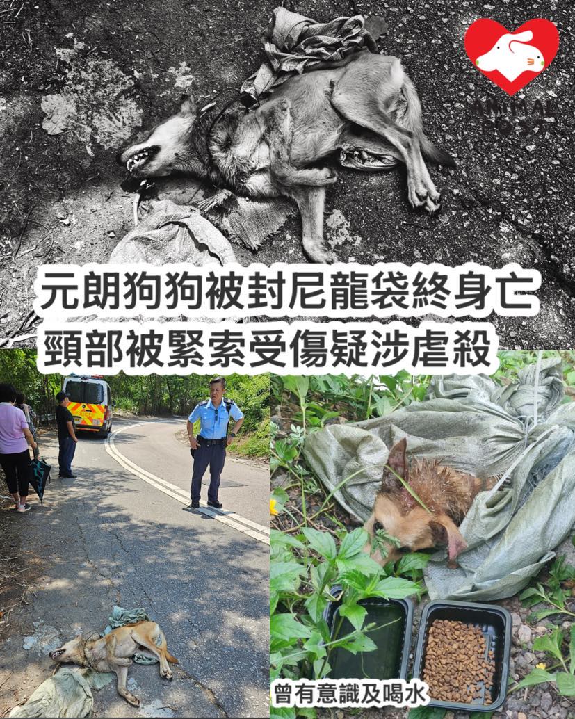 【動物突發】元朗發生令人髮指虐殺狗狗事件,昨日早上有晨運市民在元朗福順街橫洲配水庫路邊草叢發現一隻狗狗被人放入綁緊的尼龍袋,而狗狗咬穿了一角突出頭部以微弱叫聲求救,可惜毛守救援Kent到場時,狗狗已經不幸斷氣身亡。Kent表示發現狗狗頸部被地盤搭棚用的繩索索緊,有傷口及烏蠅蟲,但估計死因可能是中暑或窒息致死。晨運市民報警,警方到場將案件列作「殘酷對待動物案」,交由元朗警區刑事調查隊第9隊跟進。