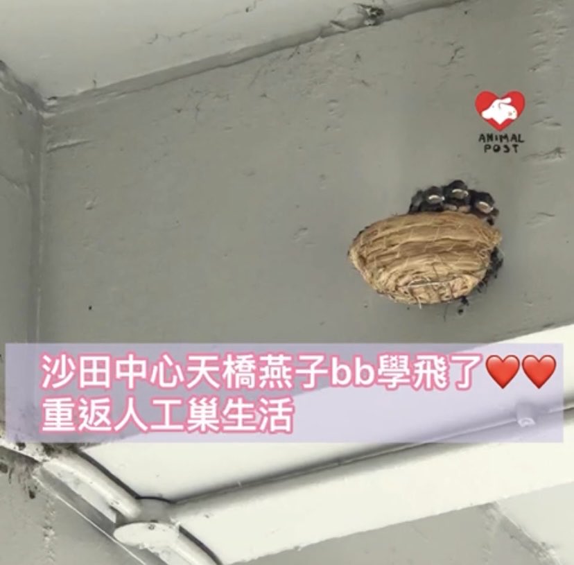 【動物專訊】沙田中心好運中心天橋一個有一家六口燕子居住的鳥巢,於5月22日被恒益物業管理有限公司派人拆毀,雛鳥從此失蹤,燕子父母連日不斷飛回已拆散的巢旁,卻已無法再一家團聚,令人心痛,事後管理公司致歉及重設人工巢。7月初已有讀者發現,有燕子爸爸媽媽重返人工巢,更令人高興的是現有3、4隻燕子BB在巢內生活,最近更開始學習飛行,令一眾街坊感歡喜,也盼望大眾從事件中學習如何保護他們及尊重他們在社區共融生活。