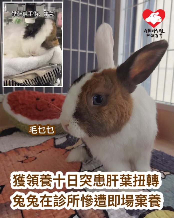 【動物專訊】領養動物不是兒戲,事前應預算好自己的負擔能力。兩歲的兔兔「毛乜乜」獲領養10日突然患上可致命的急性肝葉扭轉,領養人在獸醫診所得知要付數萬元手術費後,竟指控「香港救兔之家」隱瞞兔兔有病,表明不會付醫療費,該會為了救毛乜乜一命,只有提出接回兔兔,而該領養人欣然決定棄養。毛乜乜現時已完成手術,香港救兔之家義工Alex表示,獸醫指急性肝葉扭轉是一兩天內發生的事情,而且病因未明,不大可能是該會的照顧問題,但無奈如果他們不接收,兔兔只有死路一條。