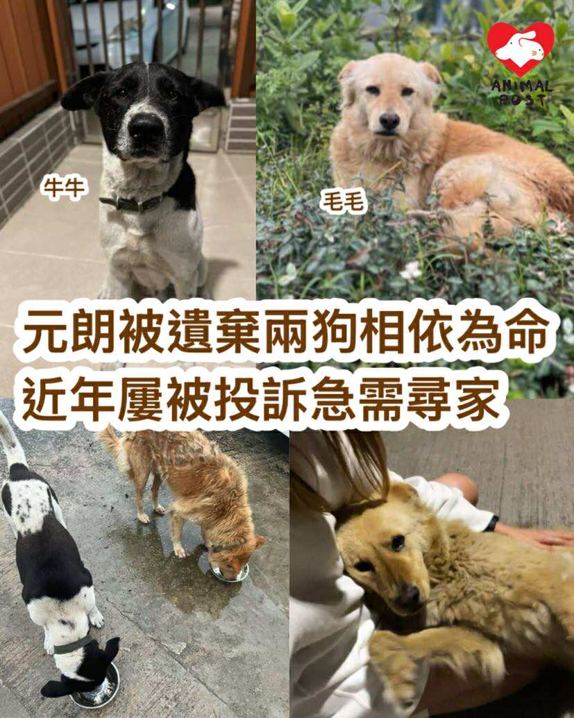【動物專訊】元朗山下村兩隻約10歲的狗狗「毛毛」和「牛牛」,均有被人遺棄的慘痛經歷,兩狗自此相依為命,亦幸運地有熱心村民餵他們。然而,近年有人向漁護署投訴兩狗追單車,漁護署亦曾派人捕捉他們。這幾年一直關顧兩狗的熱心市民Tracy表示,希望盡快幫兩狗找到領養家庭,不用再過隨時被人追捕的生活。她又表示,希望好心人能同時領養兩狗,「之前試過帶走一隻,結果兩隻狗都不肯吃東西。」