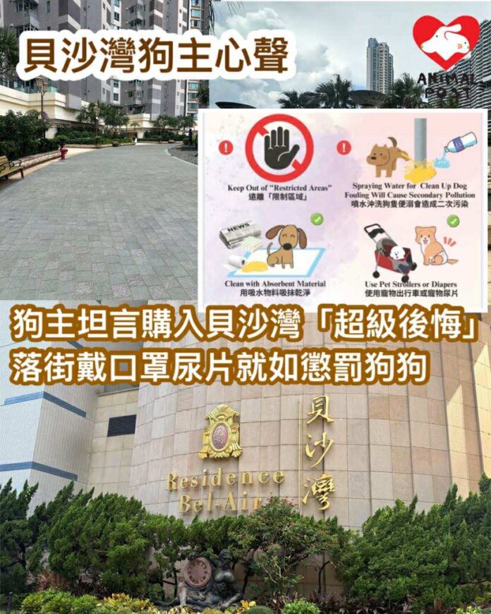 【動物專訊】貝沙灣去年開始推行針對狗主和狗狗的苛刻措施,包括用水沖狗狗便溺照罰1,500元、要求狗隻乘貨用升降機、要求狗狗在屋苑公眾範圍戴口罩等,多名狗主忍無可忍,向本報呻遭到不公對待,多名狗主均指現在帶狗散步都感到十分害怕,擔心狗狗小便後,即使清潔了也會被罰款,甚至「見到CCTV就驚」。有狗主坦言原以為貝沙灣是動物友善屋苑才購入單位,現在感「超級後悔」。亦有狗主指如果按管理處要求,要狗狗散步都戴口罩和尿片,狗狗會很不開心,形容狗狗去街本是開心事,現在好像因為他要落街玩而懲罰他。
