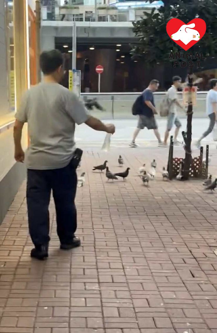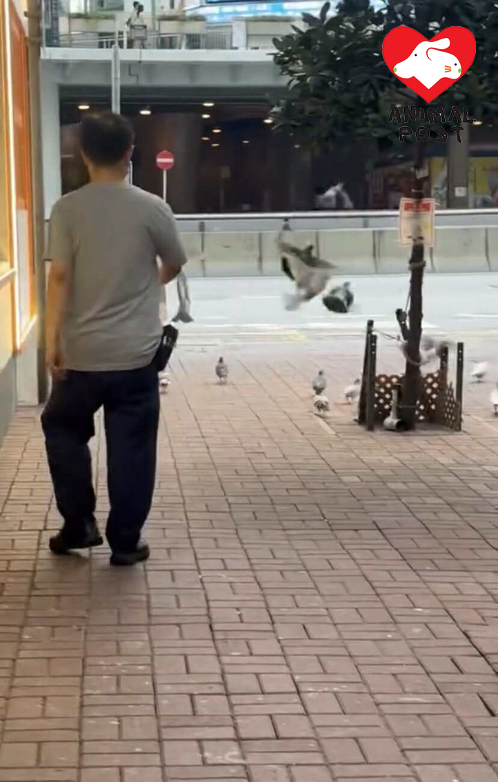 該目擊者提供的影片,顯示該男子在行人路邊行邊向地上的白鴿噴水,嚇得多隻白鴿飛走躲避。目擊者又指該男子又以掃帚掃地,更用掃帚打走還在行人路上的白鴿,不過他並沒有拍攝到該畫面。