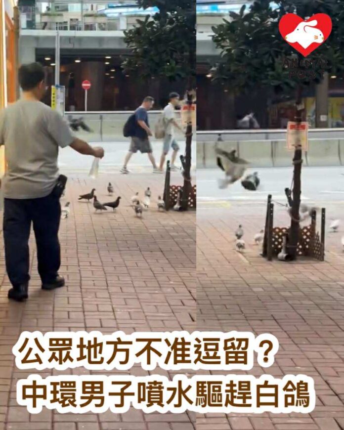 【動物專訊】有讀者向本報提供影片,指前日(9月4日)下午4時52分在中環德忌利士街目擊一名男子驅趕行人路上的白鴿,包括以水壼向白鴿噴水,目擊者更指對方曾用掃帚攻擊白鴿,但他當時沒有拍攝到該畫面。他懷疑對方的做法是虐待動物,會報警跟進。