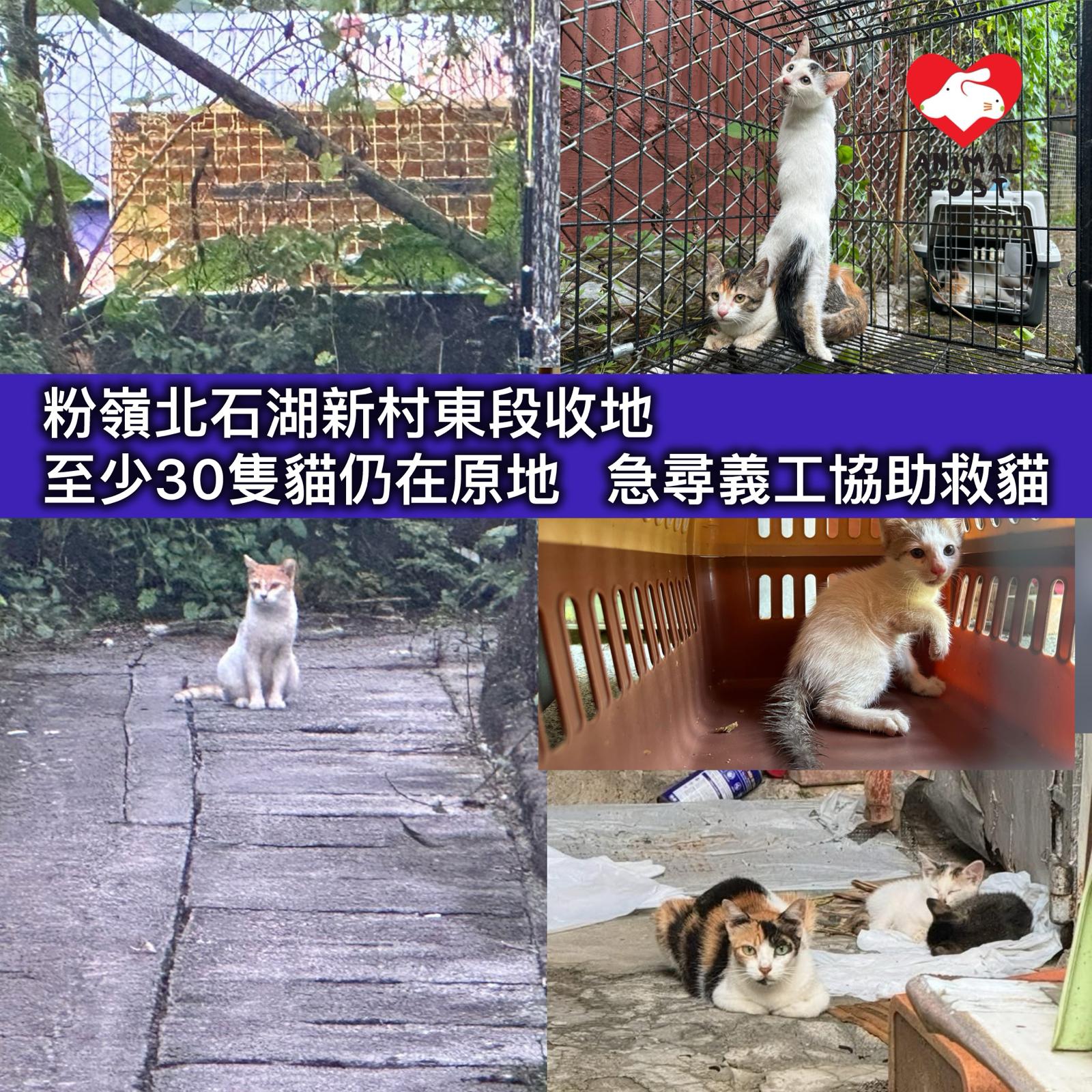 【動物突發】動物往往成為城市拆遷下的犧牲品,被人遺留在原處。粉嶺北石湖新村東段(粉嶺榮福中心隔離)正進行收地工程,原來的居民已全部遷出,卻留下數十隻居民沒有帶走的貓貓。由於貓兒眾多,燃眉之急,貓義工阿Connie盼有更多人可協助將貓兒救起及帶走,如可協助,請Facebook 聯絡聯和貓墟專頁。