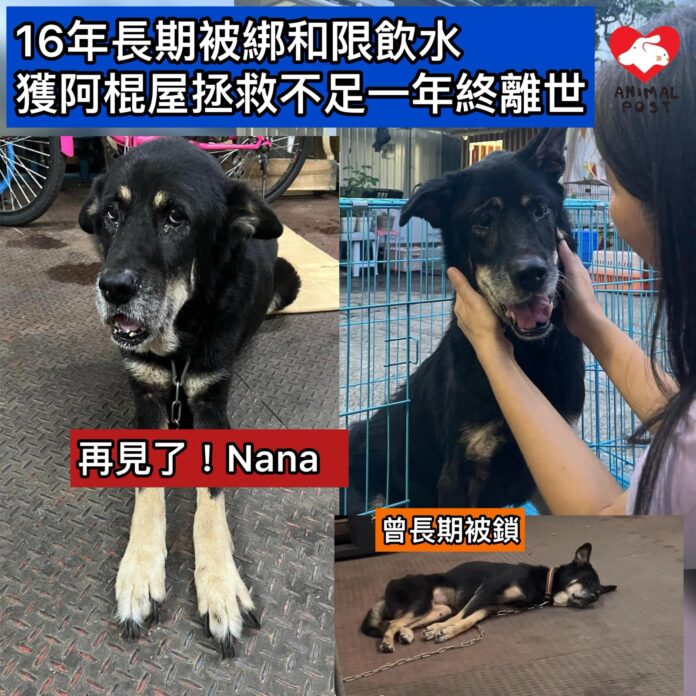 【動物專訊】狗狗的忠心未必獲得主人的憐愛,狗女Nana這一生有16年被當為看門口工具,不但長期被主人以鐵鍊綑綁,狗主甚至為免她在店內小便,每日竟只獲發少量水飲,過著慘無人道的生活。幸好在「我要辣魚蛋」義工鄒小姐多番跟進下,Nana終在去年逃離狗主的恐怖控制,並交由阿棍屋照顧。可惜幸福時間短暫,可憐狗狗Nana今日離世了,猶幸這11個月獲得阿棍屋創辦人Ivy悉心照顧和愛護。