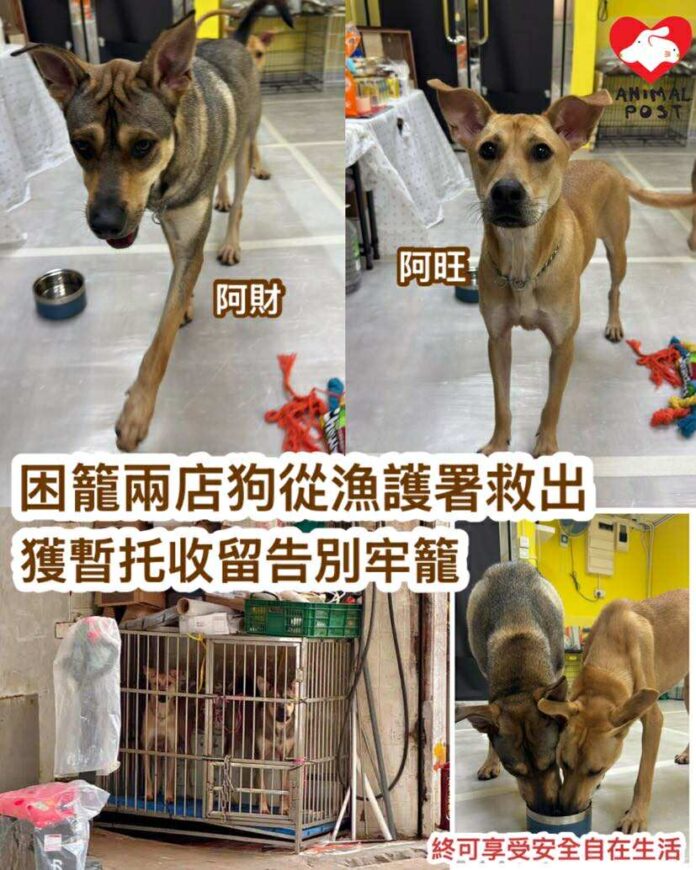【動物專訊】本報今日報道深水埗一凍肉店店主長期將兩狗困在籠中,日前更因屢遭投訴而將兩狗送漁護署棄養,事件在今日下午迎來轉機,在動物義工Roni游說下,狗主將兩狗從漁護署接回,更有好心人願意暫托兩狗,在完成棄養程序後,約兩歲的狗仔阿財和狗女阿旺晚上住進暫托處所,終於擺脫放養和困籠的悲哀生活,首次享受室內安全而又自由自在的生活。