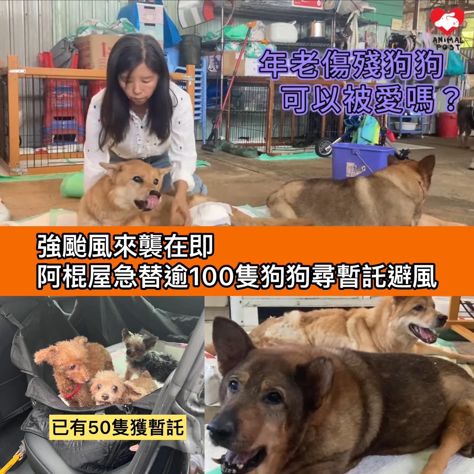 但該場尚有逾百隻年紀大、體弱及性格較不穩定的狗狗,尚未找到暫托,Ivy希望嘗試為這些難度較高的狗狗急尋暫托。而Ivy在颱風期間,仍會留守場內照顧留在場內的動物。如可協助的人士,可透過facebook或ig 專頁聯絡阿棍屋。