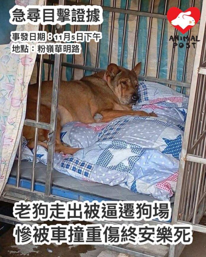 【動物專訊】粉嶺一個狗場早前被逼遷,圍欄被拆除,沒想到逾10歲的老狗「長發」因此遇車禍喪命。長發前日下午從該狗場跑出去,不幸在華明路被車撞倒輾過重傷,被送到愛護動物協會醫治,狗狗盆骨嚴重碎裂,肺葉出血,口部亦嚴重受傷,最終要安樂死。場主Bonnie十分傷心,亦想幫長發討回公道,指看到現場血漬超過一個車位,顯示當時撞到狗狗的沖擊力很大,形容長發是老狗,不會快速跑出馬路,懷疑肇事車輛當時超速駕駛。