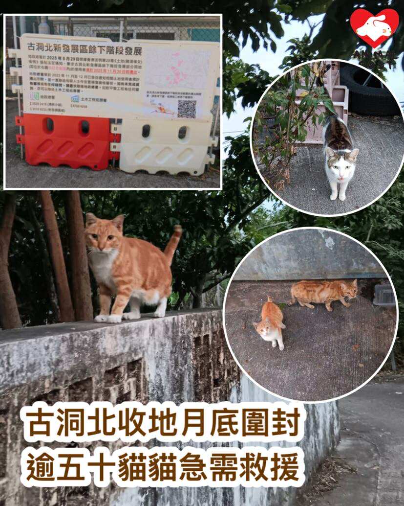 【動物專訊】古洞北煙寮區面臨收地,將於本月30日圍封,有餵貓婆婆為村中逾50隻社區貓求救,希望找到動物機構或愛心家庭,能夠暫時安置這批將流離失所的貓貓,婆婆表示,有幾隻貓媽媽正懷孕,情況很緊急,她也正嘗試救起這些懷孕貓,但她自己沒能力救走這些社區貓,因此希望大家能齊心合力幫忙。