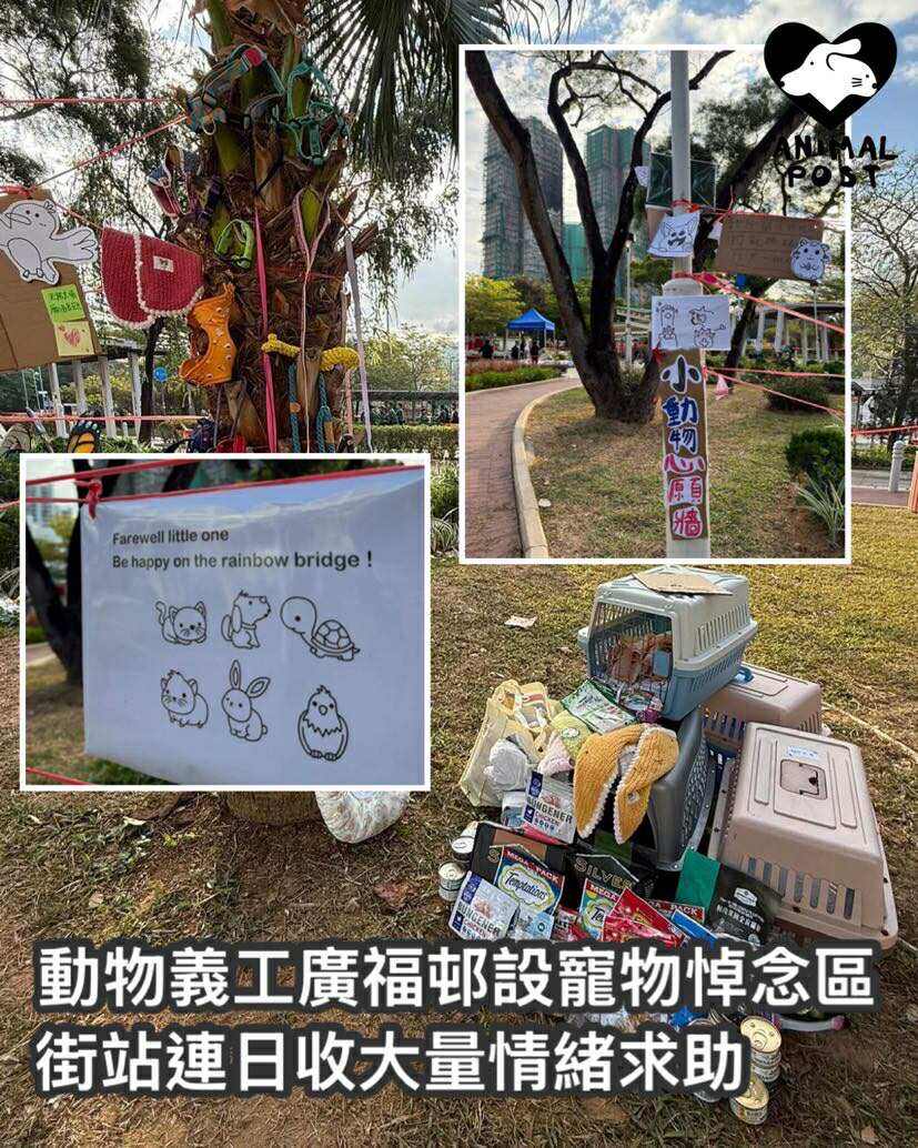 「寵物家屬悼念區」原設於廣福邨廣福休憩公園,義工花心思作出布置,只希望失去心愛動物的主人能夠放下自責和愧疚,為走上彩虹橋的動物送上祝福。連寵拯救隊義工表示:「目前獻花數量龐大,需要額外的空間擺放,加上有人蓄意投訴,目前寵物紀念區搬了去大涼亭旁。」