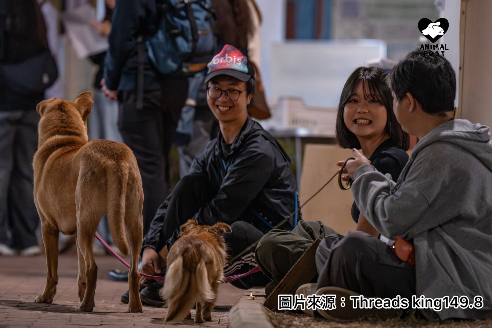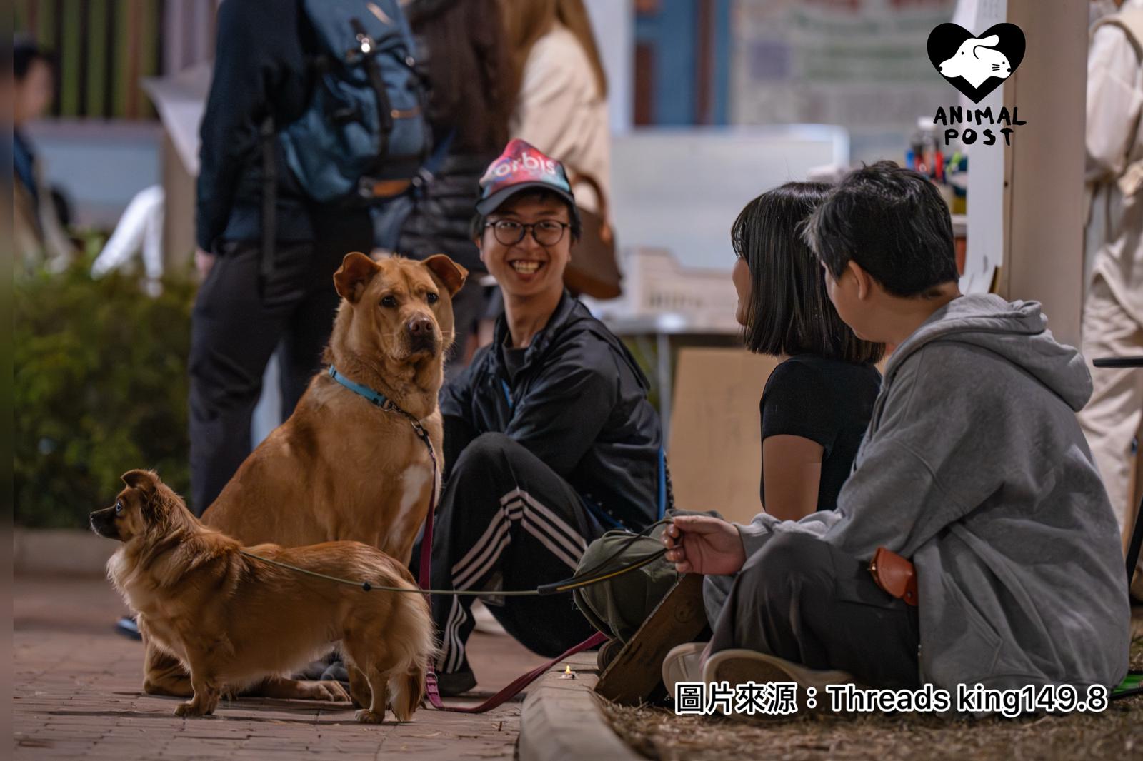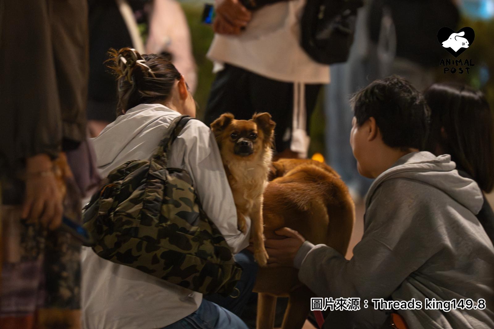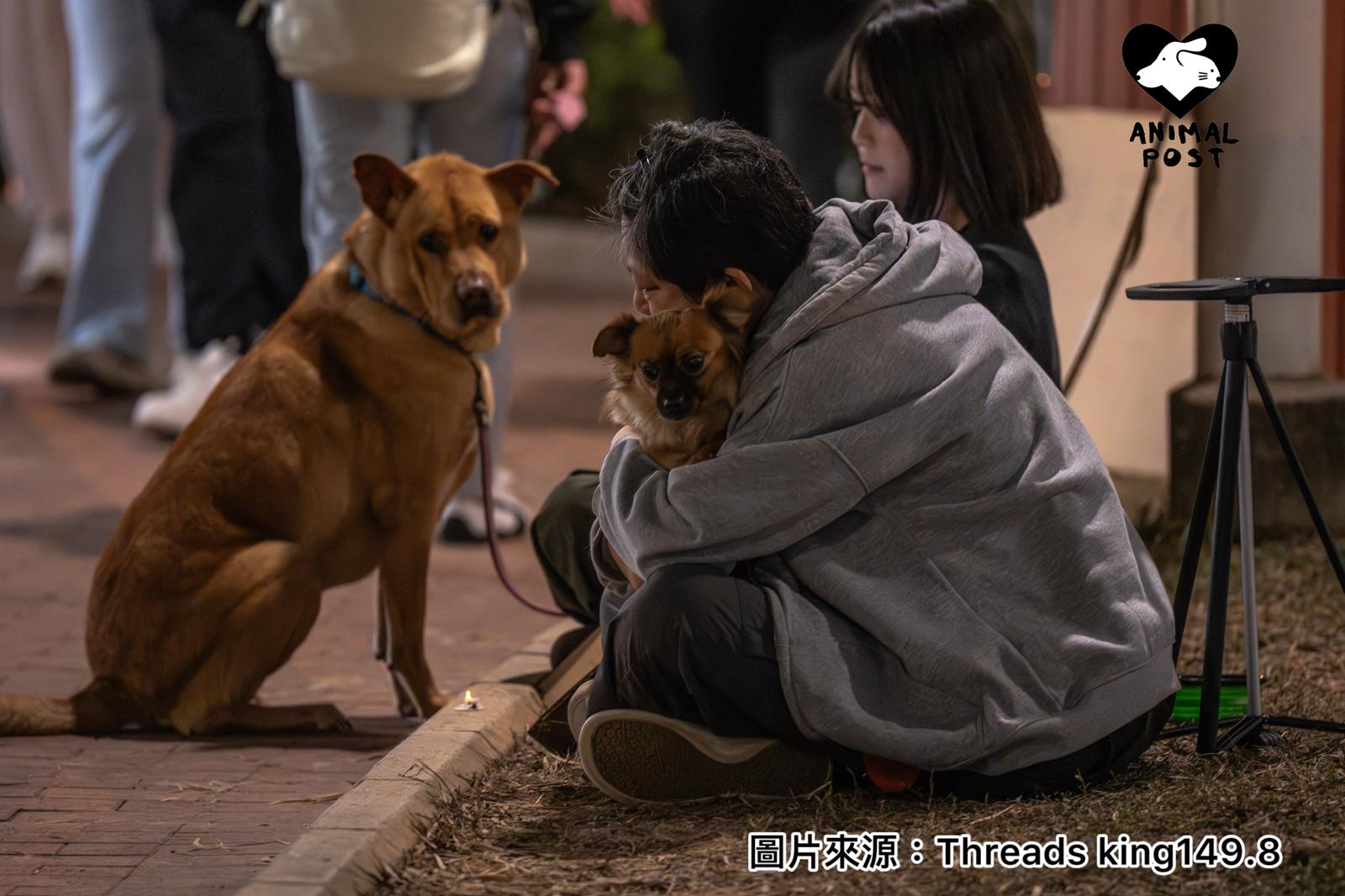 在網上廣傳著幾張相片,是在黑暗的宏福苑中有兩隻小狗靜靜地坐在人群中。原來他們正是動物救援機構唯珍牽Regina帶來的兩隻狗狗丁丁及奇奇。Regina接受本報訪問表示,今次帶兩隻狗狗到災場,狗狗丁丁及奇奇其實是治療犬。以她經驗所知,動物有助令放鬆心情或者舒緩情緒。她見到有不少市民前來摸狗狗、餵他們吃零食,過程中互相傾訴,令情緒放鬆一下。