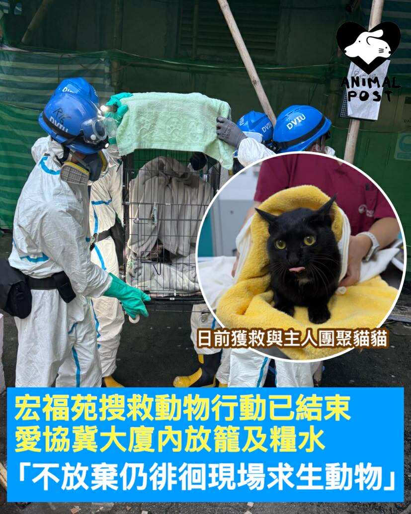 【動物專訊】大埔宏福苑大火災難,百多人和百多隻動物不幸離世,仍有約80多隻動物下落不明,愛護動物協會表示,災難遇難者身份鑑定組(DVIU)的搜救動物行動已於昨日結束,愛協提出多項建議,包括在大廈內設置捕貓籠、水及糧食,不放棄任何可能仍在附近徘徊求生的動物,當接獲官方通知在災場發現生還或離世動物,愛協會第一時間趕赴現場協助。另由動物義工於廣福邨設置的紀念區,亦於今日結束,義工盼大家帶重新振作的心和力量,好好用力愛身邊每一位,好好生活。