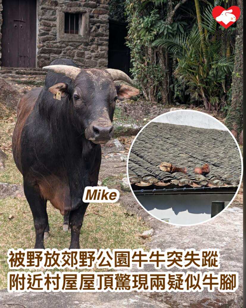 【動物專訊】漁護署於11月19日將原本在西貢十四鄉居住的牛牛「羅蘭」、「六嬸」和「Mike」搬到西頁的郊野公園,有牛義工定期探望他們,但他們今日去探望牛牛時,卻發現Mike不見蹤影,更恐怖的是他們在一間村屋屋頂,竟發現兩隻切口齊整的疑似牛腳,令義工擔心Mike已經遇害。義工已經報警、漁護署及愛護動物協會,直言不應有任何非法屠宰牛隻的事件發生。