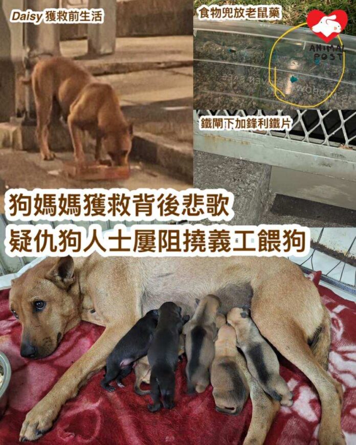 【動物專訊】本報昨日報道狗媽媽Daisy掉落坑渠,獲救後誕下了7隻狗BB,這個救一命變救八命的故事,背後卻是社區狗慘遭仇狗人士針對和壓逼的悲歌。有餵狗義工對本報表示,Daisy之前生活的位置,是某政府部門的土地,惟該處懷疑有仇狗人士多次阻撓義工餵狗,包括張貼自製禁餵狗海報及將義工車牌公開,義工還曾發現食物兜被人擺放老鼠藥,而狗狗平時會穿過的鐵閘底部,早前更被人安裝鋒利鐵片,義工曾目擊有狗BB打算穿過鐵閘時被夾受傷慘叫。