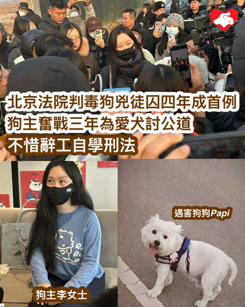【動物專訊】北京法院近日宣判毒狗兇徒張志華投放危險物質罪成,判處監禁4年,是內地就毒狗案件立案及判刑的首例,被告在2022年9月於北京朝陽區暢頤園社區落毒,11隻狗狗受害,當中9隻狗狗死亡。遇害狗狗Papi的狗主李女士報警追究,更不惜辭去工作自學《刑法》和《刑事訴訟法》,又聯繫其他10名苦主發起民事索償訴訟,經過3年2個月,北京市朝陽區人民法院溫榆河人民法庭終作出一審宣判被告罪成,為遇害狗狗們討回公道。