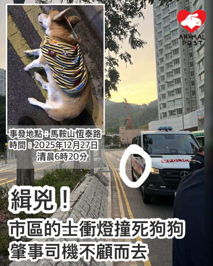 【動物專訊】緊急緝兇!一隻哥基犬昨日(12月27日)清晨6時20分左右在馬鞍山恆泰路隨主人在行人過路燈綠燈過馬路時,慘被一輛衝紅燈的紅色的士撞到輾過,當場身亡,據目擊者所述,肇事的士事不但沒有停車,但即場逃跑不顧而去。狗主已經報警,現急尋拍攝到當時情況的目擊證據,盼將兇徒繩之於法,為慘死狗狗討回公道。