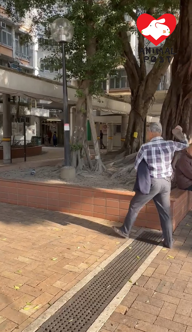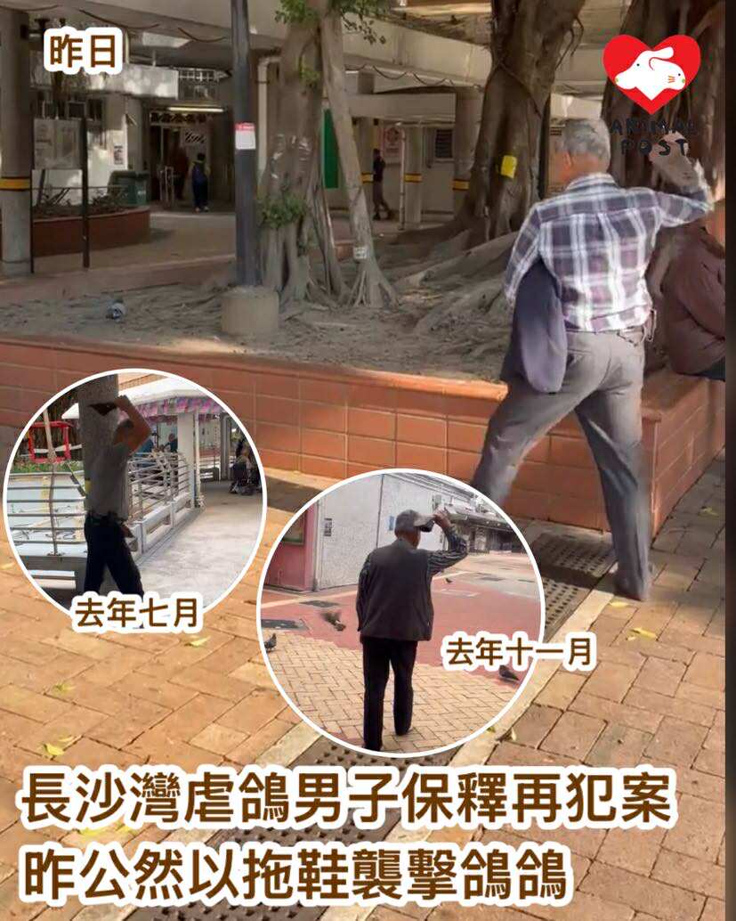 【動物專訊】一名多次在長沙灣麗閣邨襲擊白鴿的71歲吳姓男子,去年被警方拘捕後竟毫無悔改,昨日再被人拍攝到於附近的麗安邨以拖鞋襲擊白鴿,目擊者已經報警,批評兇徒光天化日肆無忌憚行兇,據他所知及目擊,兇徒至少在去年6月、7月、11月及今年1月犯下5次虐鴿罪行。