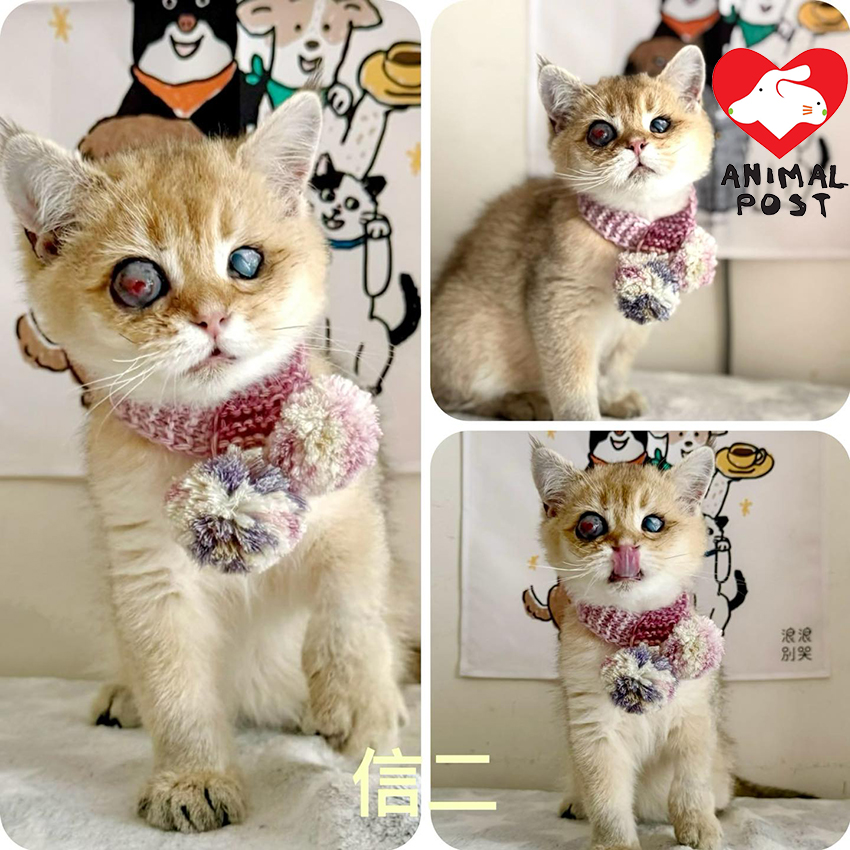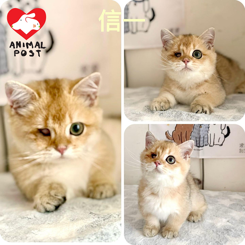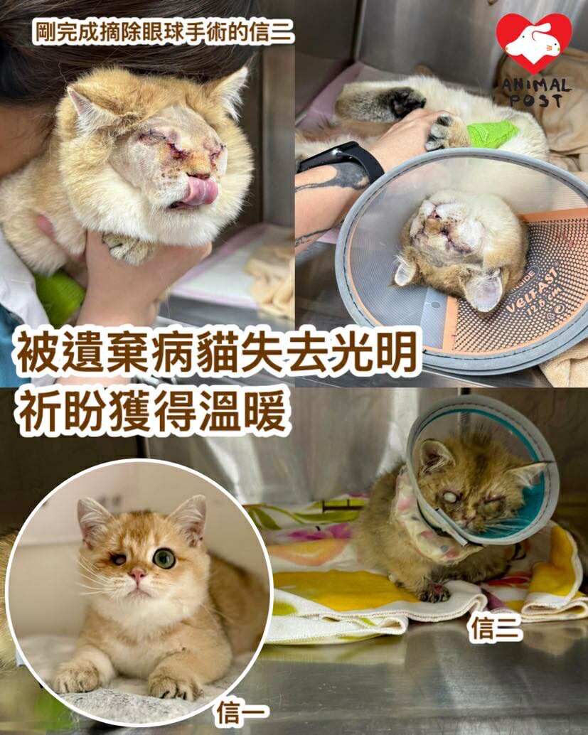 兩隻幼貓於去年10月被人以貓袋遺棄在戶外,被熱心市民發現並聯絡浪浪之家接手馬上送院就醫,兩隻貓貓不但眼睛嚴重發炎,還有低溫、白血球超標、極瘦弱、嚴重貧血等,情況極嚴重。獸醫判斷信二兩隻眼及信一的右眼均已保不住,但因為太年幼及太虛弱,所以先交暫托家庭悉心照顧和養好身體,才能進行摘除眼球手術,義工為兩小貓改名為信一和信二。