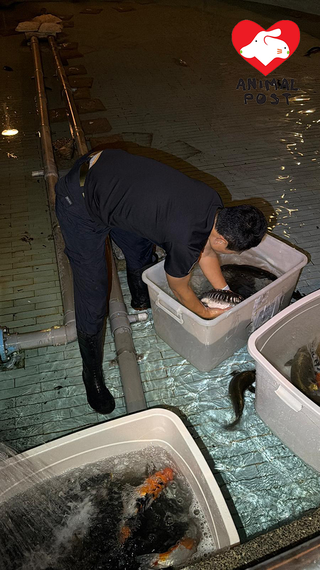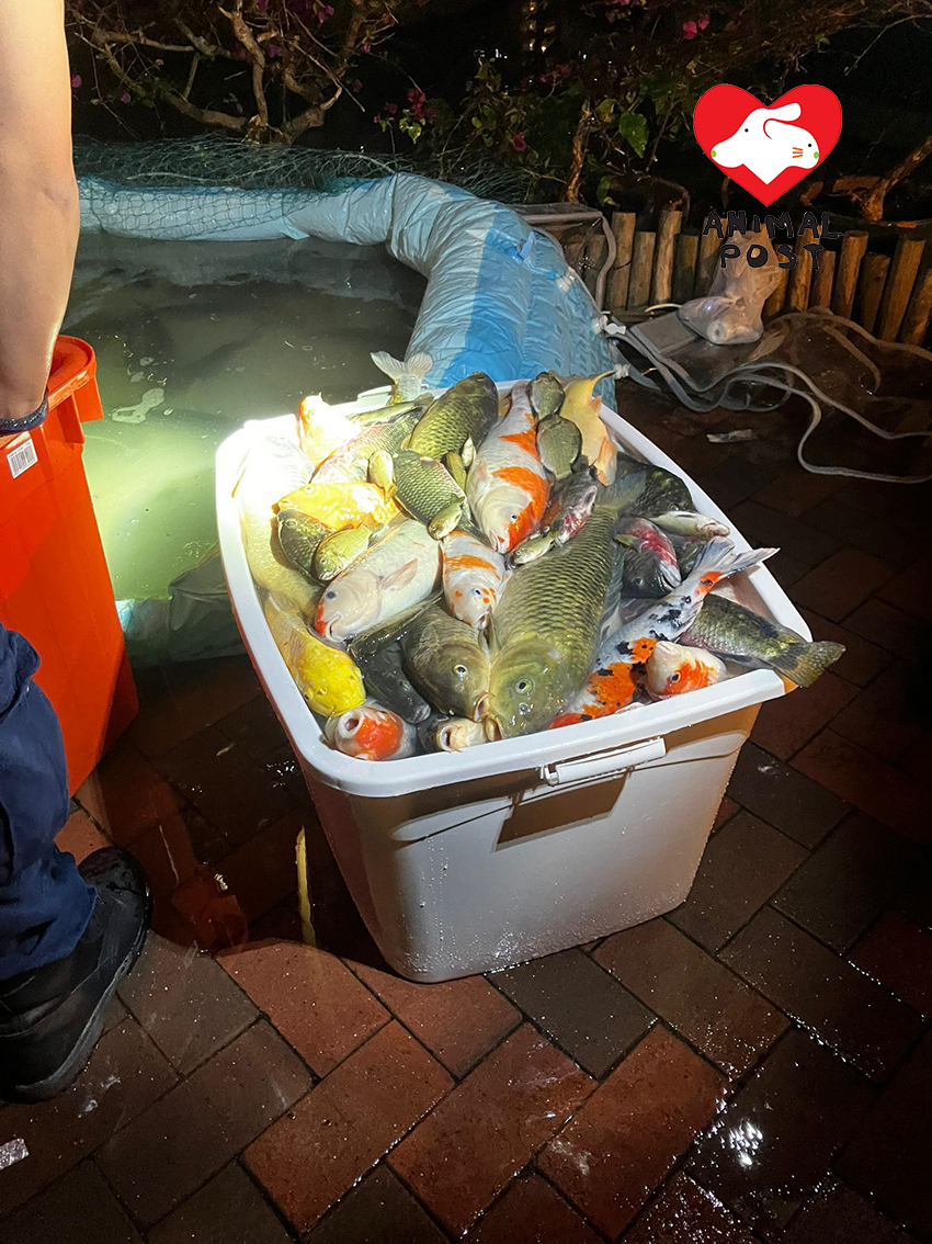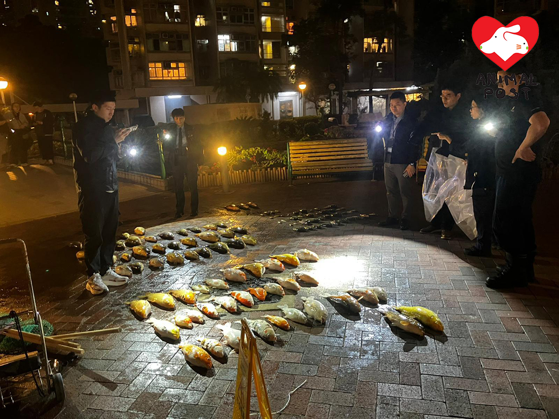 【動物專訊】將軍澳景林邨昨日清洗魚池變大屠殺,釀至少122條魚慘死,動物救援機構「龜途」創辦人阿邦深夜趕到現場救援,和多名街坊聯手將81條生還的魚放到另一個水池,直到凌晨4時才完成救援,惟當中有7條魚還是不幸離世,另據知今早亦有魚死亡,死亡數字繼續增加。阿邦指管理公司責無旁貸,應該就洗池制訂正確程序,他又批評很多人在魚池棄養和「放生」魚,等同間接將他們殺死。