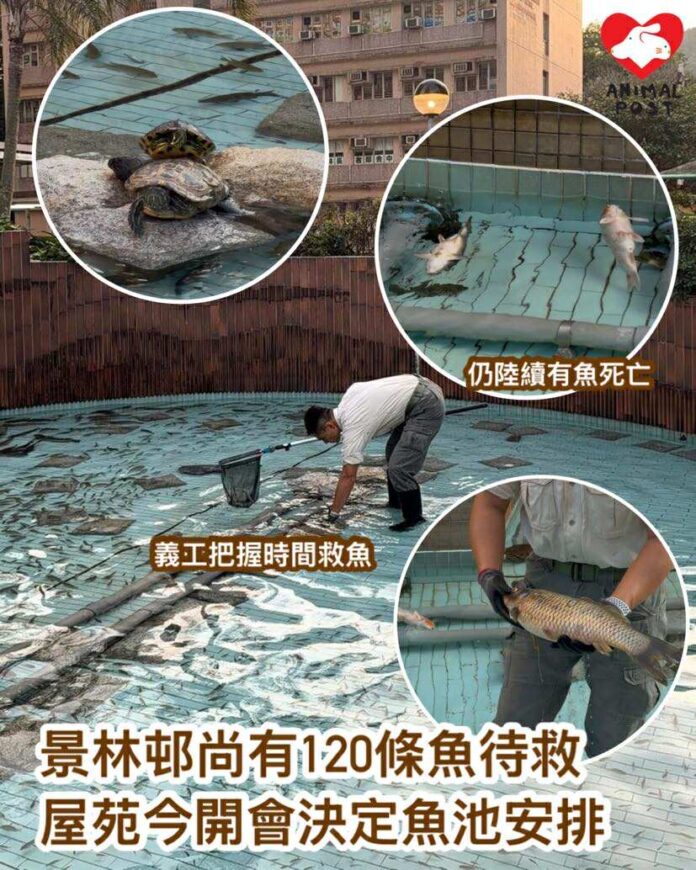 【動物專訊】將軍澳景林邨於上月尾因清洗水池,疑因清潔工人沒有委善安置池內的龜和魚,最終導致約200條魚缺氧死亡,引起各界關注及嘩然,涉及的清潔工人更以涉殘酷對待動物被捕。然而這水池尚有120條魚待救,一直跟進該水池及龜狀況的組織龜途負責人阿邦表示,該水池多處損壞,短期難重開,今日將清理該池及救起該批魚,據知該屋苑法團與管理公司今日開會決定會否封池。同時,他認為單是救走游魚,治標不標本,正努力游說該法團及管理公司,希望屋苑可以封池,阻止悲劇不斷再發生。