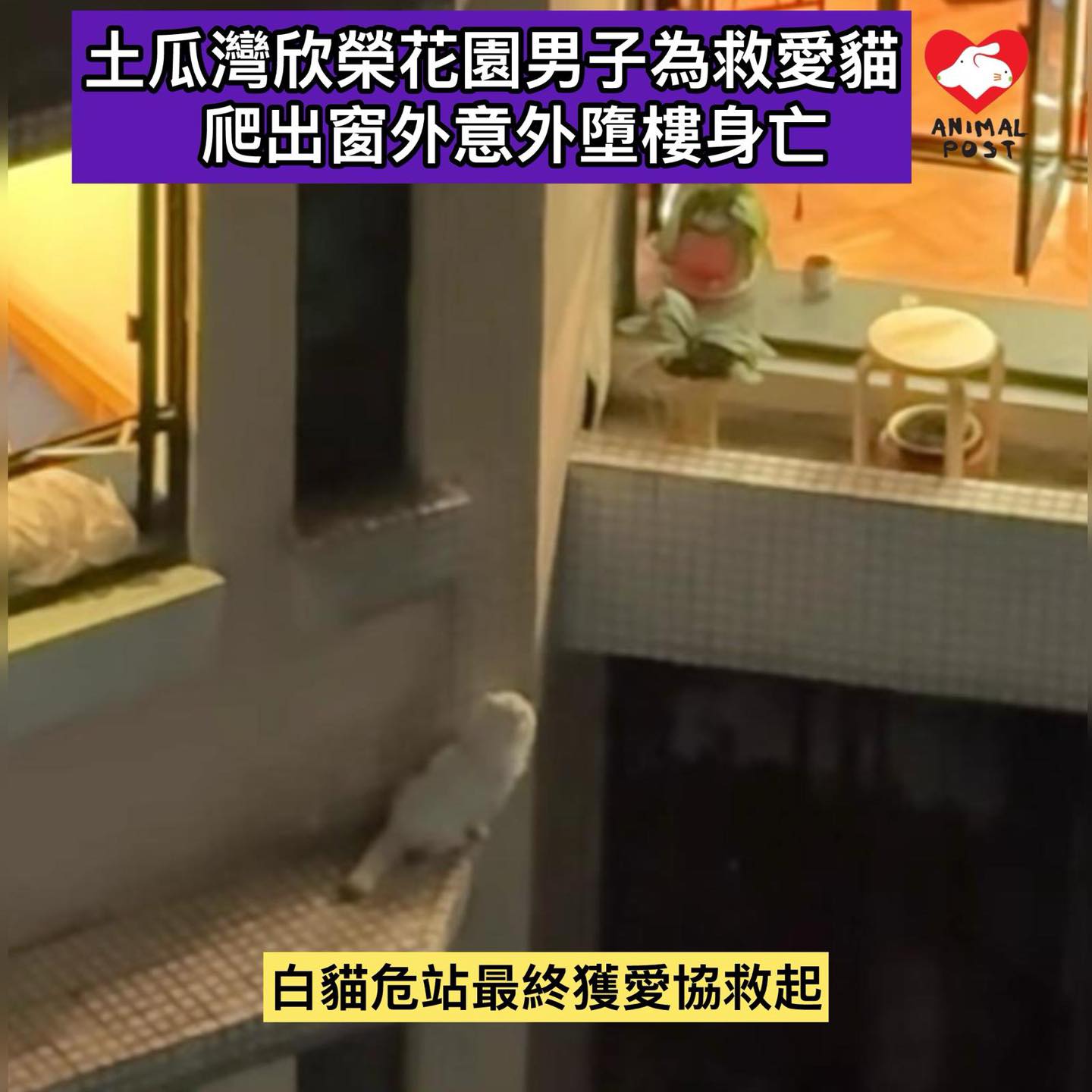 土瓜灣欣榮花園昨晚(2月18日)發生貓主救貓墮樓身亡事件,63歲姓官男貓主攀出窗外嘗試救走到窗外簷篷的愛貓,結果失足墮樓,送院後證實死亡。貓貓由愛護動物協會督察以套索救回屋內,沒有受傷。