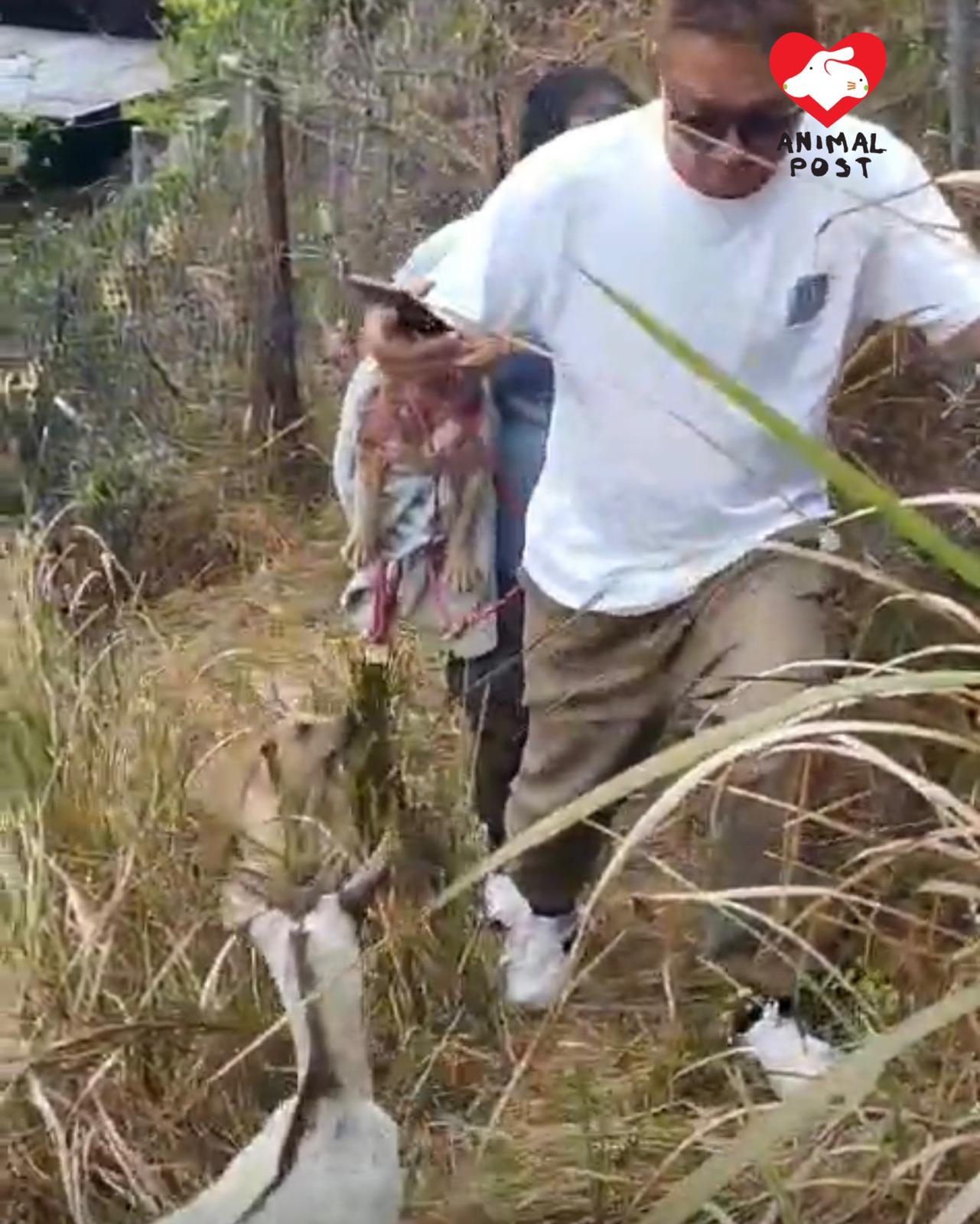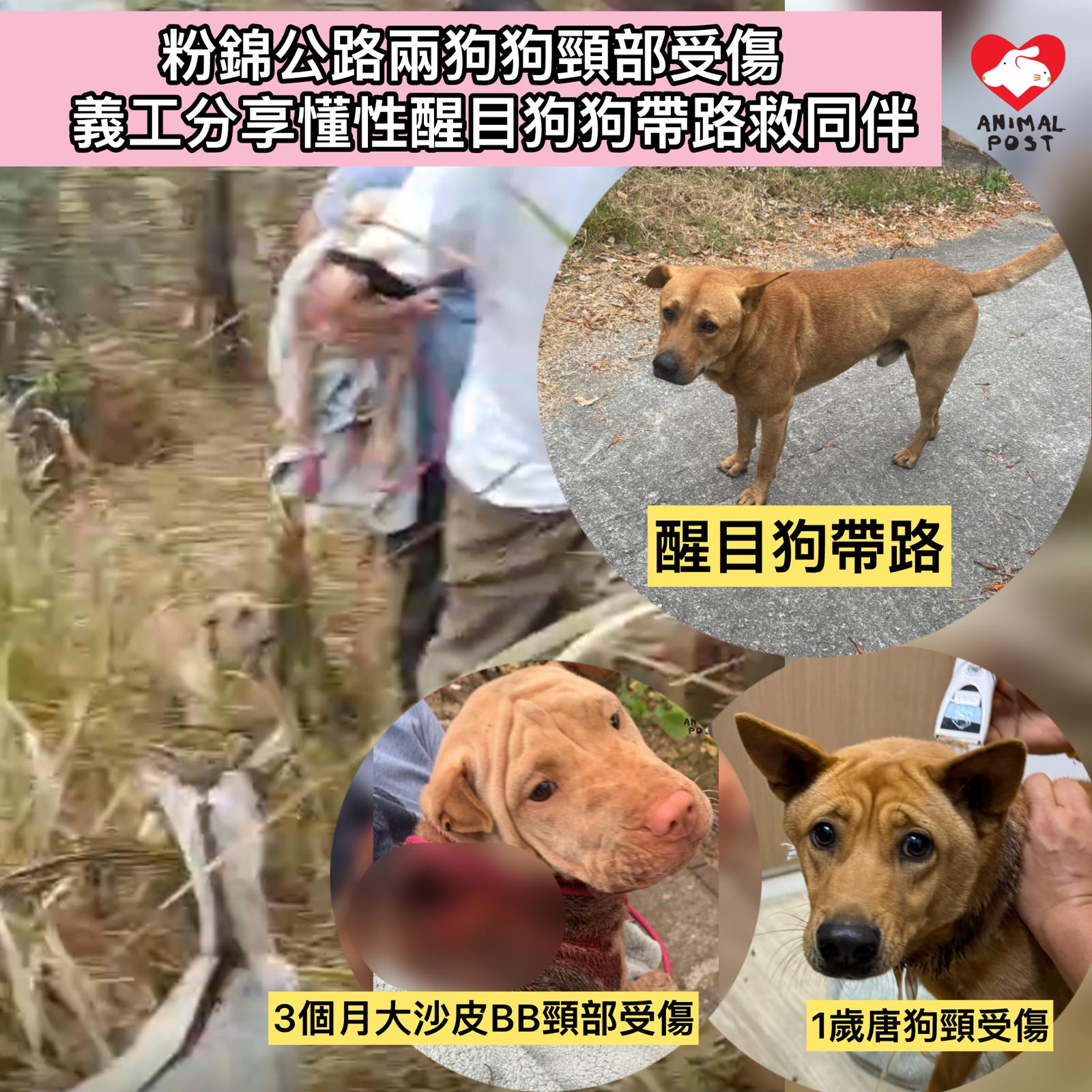 【動物專訊】昨午有行山人士在粉錦公路打石湖村,發現兩隻狗狗頸部嚴重受傷,動物組織香港流浪狗之家負責人Angela隨即與兩名男同事趕往現場救狗。義工首先救起一隻頸部受傷的唐狗後,惟另一隻受傷的沙皮狗BB卻失去蹤影。就在此時,一隻非常懂人性又聰明的狗狗突然現身,主動立即引領義工往山方向前行,並不時回頭示意,最終成功帶領眾人找到受傷的沙皮BB。這隻醒目狗狗一直守候在旁,目送兩受傷狗狗被抱上車後,才安心離開,場面令人十分感動。