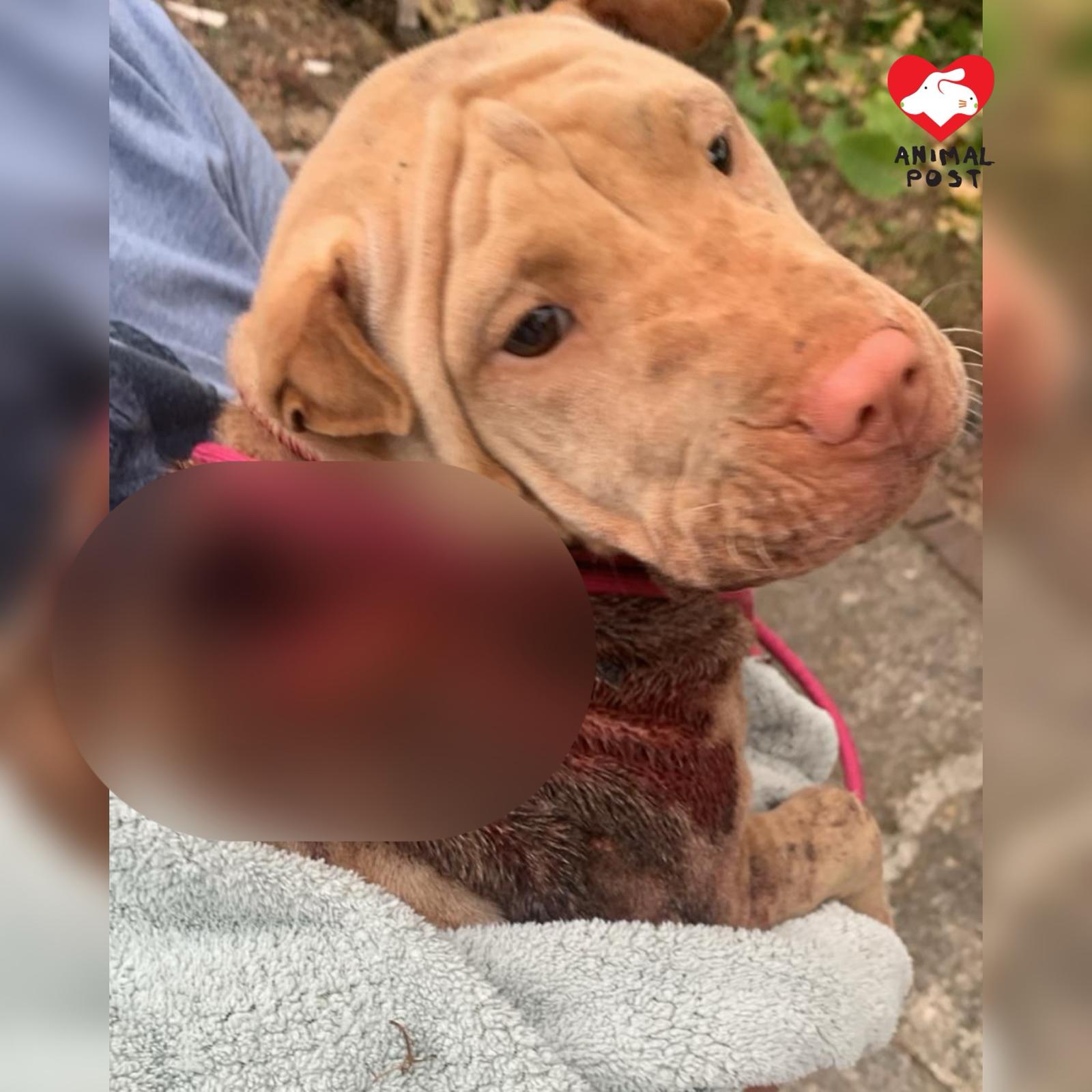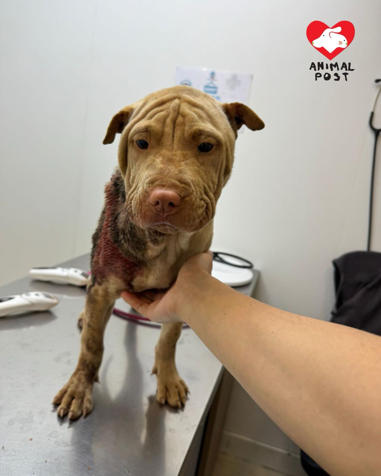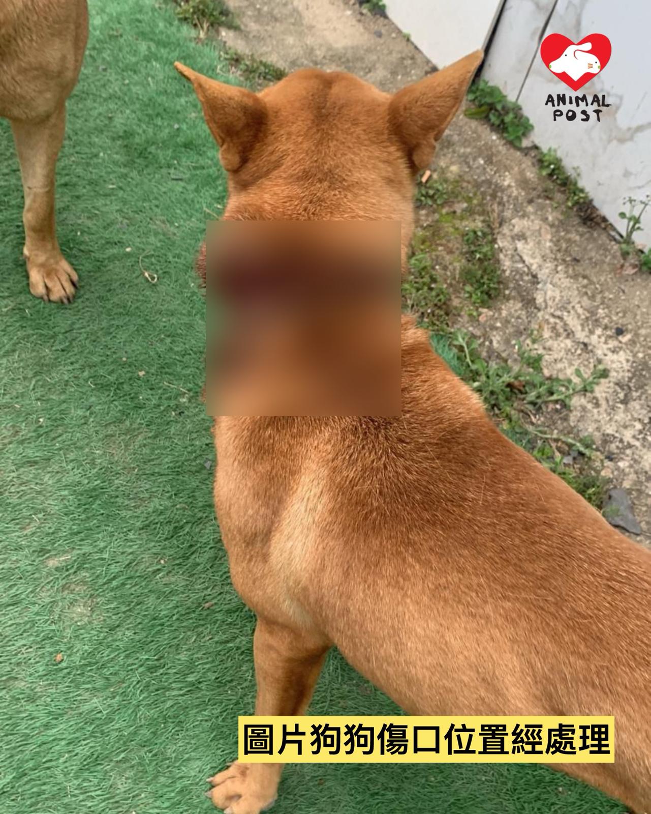 流浪狗之家創辦人Angela表示,她昨日在群組看到有人發現在粉錦公路打石湖村附近,有一隻沙皮BB頸部有一個很大的傷口,Angela立即著同事駕車前往,與發現的義工會合後,更首先在一個士多啤梨園發現一隻同樣頸部受傷的狗狗,該場主見有義工到場,立即指這狗狗並非是他的,著義工拿走及帶他醫治。Angela立即拖著這狗狗,另外兩名男同事及義工立即再尋找沙皮bb,惟苦尋不果。