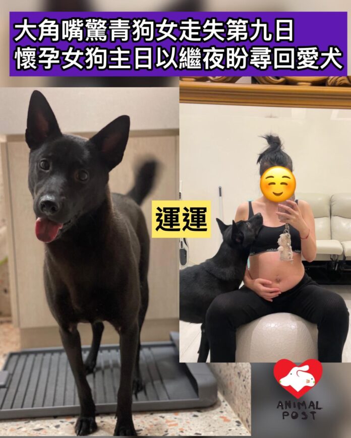【動物專訊】一隻曾遭虐待及以石頭充飢的黑色狗女運運,獲義工救起後獲周小姐領養,原已開始了有家及獲家人愛錫的生活。無奈9日(2月21日)前,義工希望探望運運,周小姐拖繩帶著運運外出,行至大角嘴油站附近時,運運突然驚慌並縮身甩繩走失了。腹大便便的周小姐臨盆在即,連日來日以繼夜四出尋訪愛犬,她坦言仍會堅持尋找愛犬,「因為就是我的家人,我的大女!」