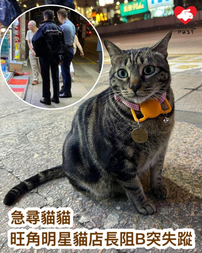 【動物突發】經常在旺角彌敦道對出的一個巴士站等車的旺角藥房貓貓阻B,今晚9時30分突然不見了,店主已報警求助。據了解,有粉絲目擊阻B被兩名女子抱走,而阻B的AirTag在弼街位置被停止。阻B關注組呼籲各界幫忙提供消息,並希望盡快尋回阻B。