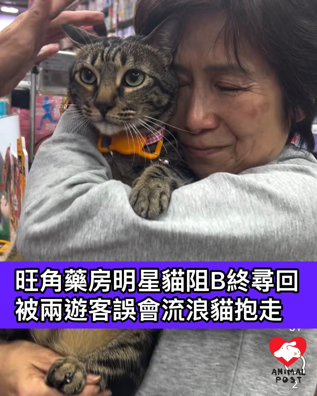 【動物專訊】經常在旺角彌敦道對出的一個巴士站等車的旺角藥房貓貓阻B,昨晚9時30分突然不見了,店主已報警求助,義工及店員四出尋找。據知,警方今日翻查附近閉路電視發現,阻B由兩名外籍女遊客抱走,疑誤以為阻B是流浪貓帶回旅館,警方今日拍門取回阻B及已交還店主。阻B關注組會長程程及阻B契媽證實已尋回阻B,她們均非常開心,及已提醒店主及義工日後必須更小心阻B。
