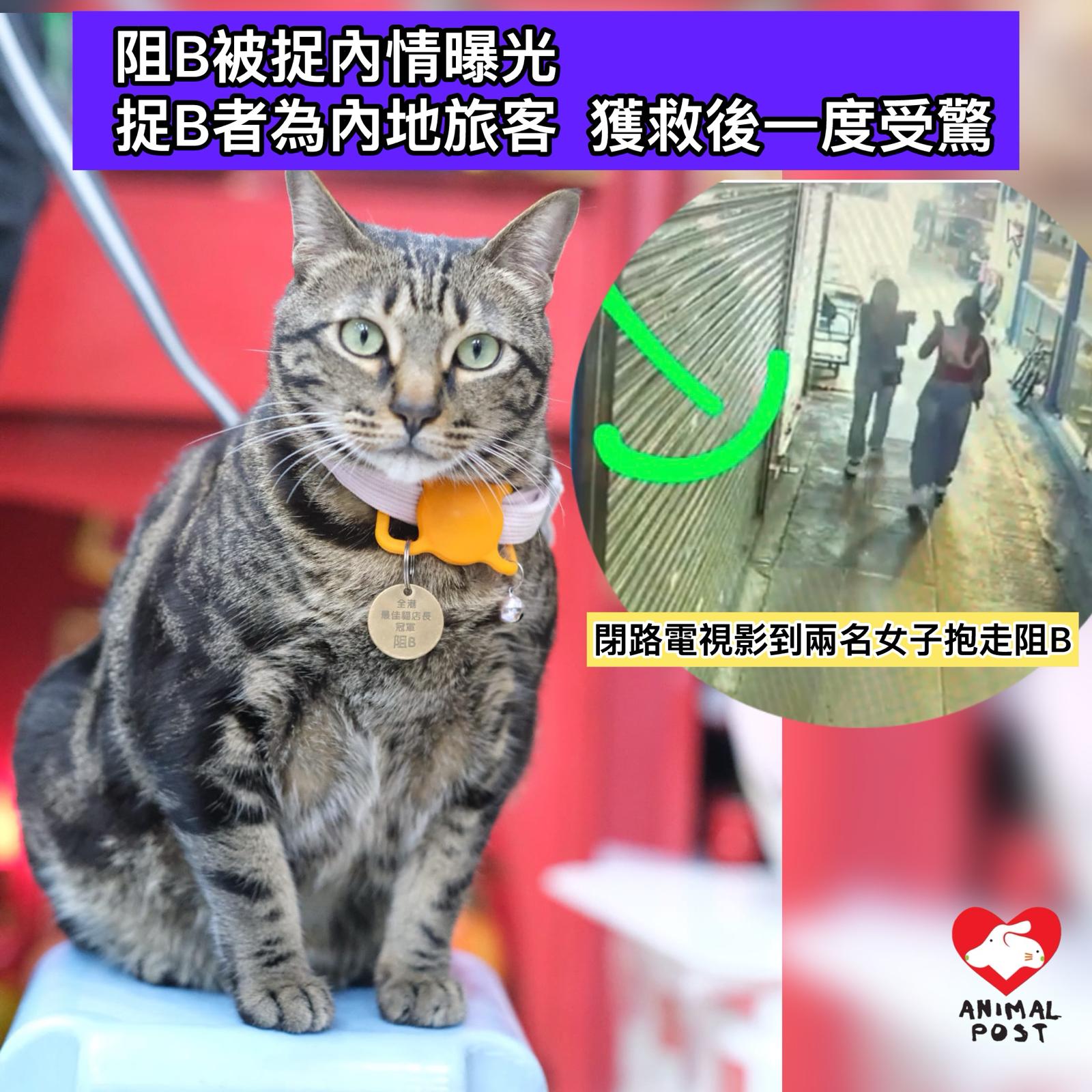 【動物專訊】旺角彌敦道一間藥房貓店長「阻B」昨晚突然被捉走,令貓主、藥房店員及一眾店員心急如焚。今日警方翻查閉路電視,終發現兩名染了頭髮、自稱是旅客的內地女子將阻B捉走,並帶了上附近的金倫大廈旅館。據知,有關女子為內地旅客,操流利廣東話,現於旺角警署被扣留中,而阻B獲救後也全身佈滿煙味及一度感到驚慌。