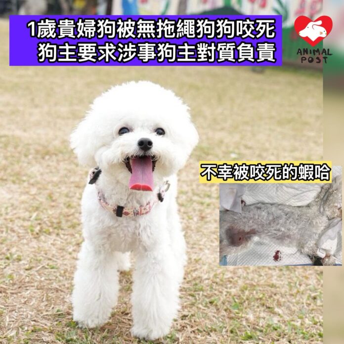 【動物專訊】元朗八鄉昨日發生一宗貴婦狗被咬死悲劇。狗主Ivy接受本報訪問表示,她正在旅行期間,其飼養的貴婦狗蝦哈交由友人照顧,友人帶同蝦哈前往元朗河背水塘遊玩時,突然遭一隻沒有拖狗繩的大狗攻擊,蝦哈左後腿不幸被大狗咬傷,雖然其友人立即帶蝦哈送往獸醫診所急救,惟蝦哈最終傷重不治。Ivy當日已立即返港,惟愛犬已不幸離世。無奈她報警,警方向她指狗咬狗不能落案,現時她希望涉事狗主與她對質及負責任,賠償她失去蝦哈之痛。