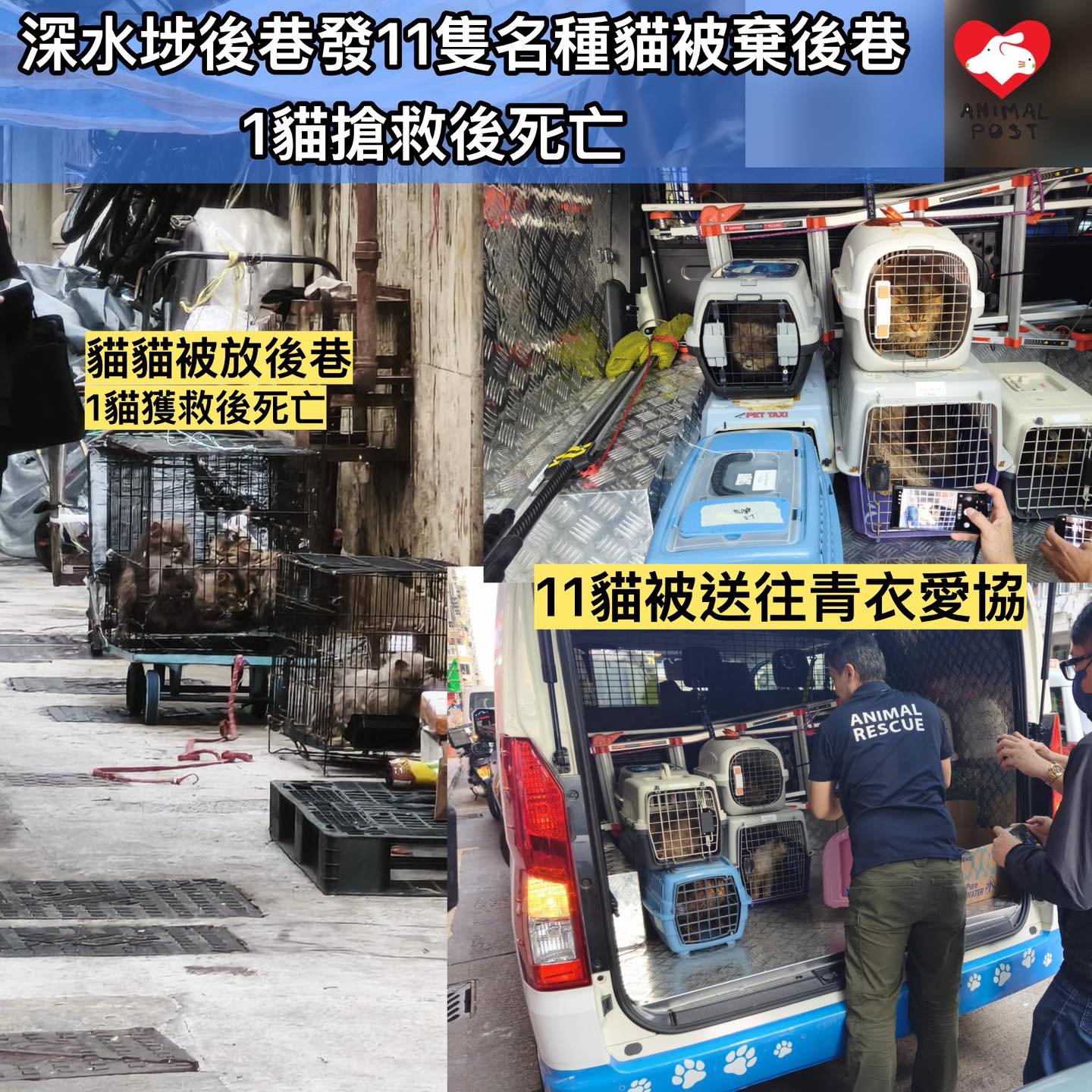 【動物突發】今日下午4時20分,有市民報案,於茘枝角道300號後巷發現11隻名種貓被放於兩個狹窄的鐵籠內,被人放於環境不潔的後巷。警方現時在場調查,及已將後巷封鎖調查。該批貓隻為英國長毛髮貓及部分為唐貓。愛協已到場協助,並將該11隻貓送往青衣愛協拯救,據知其中一隻送院搶救不治。