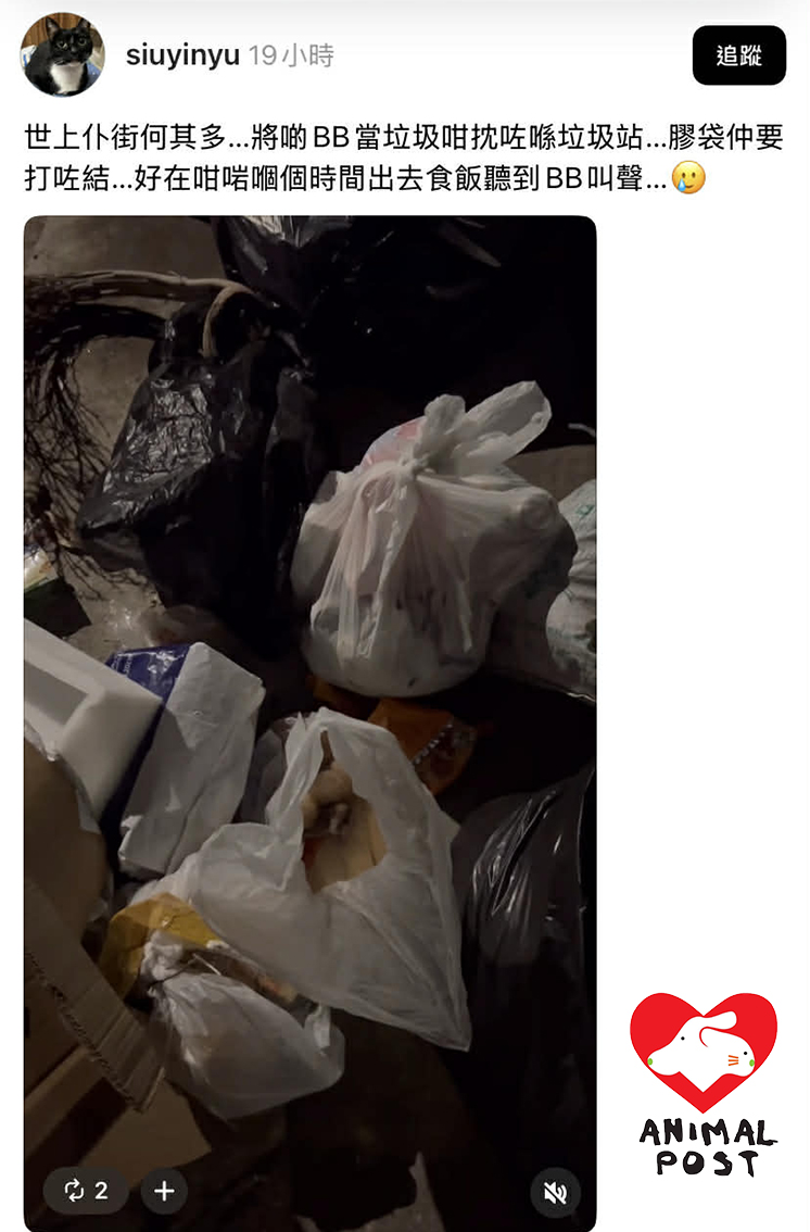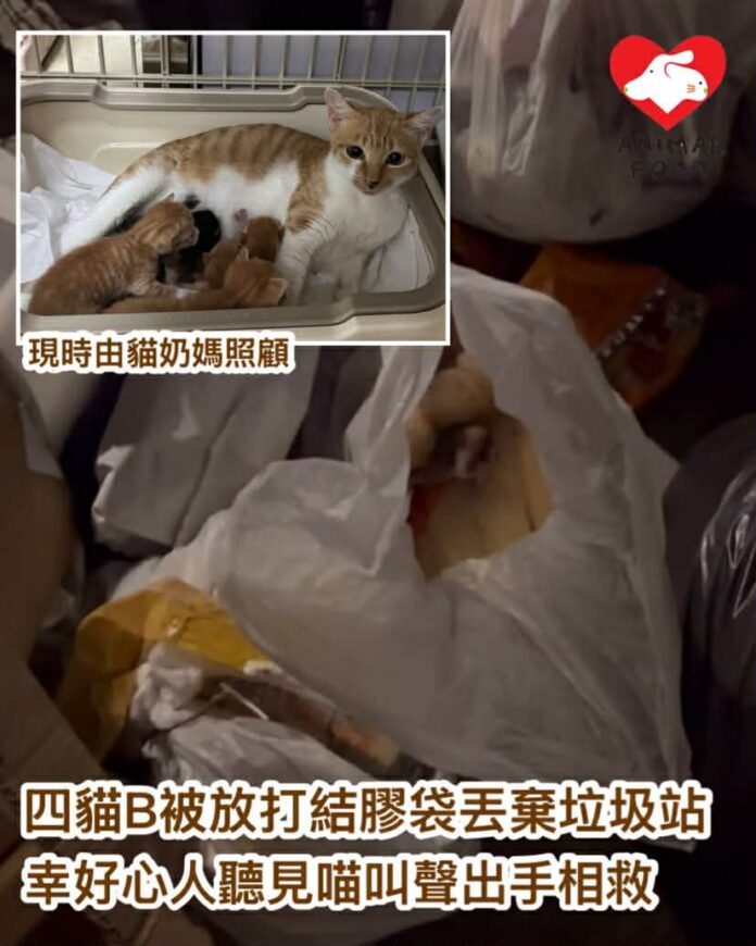 【動物專訊】遺棄動物是十分可恥行為,將初出生貓BB放在打結膠袋當垃圾丟棄,更是謀殺動物罪行!元朗白沙村有義工昨晚在垃圾站聽到幼貓叫聲,赫然發現聲音竟是來自一個打結膠袋,裡面有4隻出生不久的貓BB。