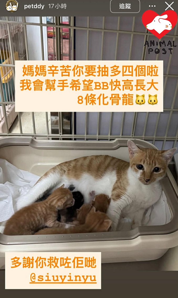 而今次出手相救的奶媽貓,原來都是早前在同一條村一家五口被人用紙箱丟棄在垃圾站,與今次遺棄事件,是一個村頭一個村尾,惟不知是否同一人所為。