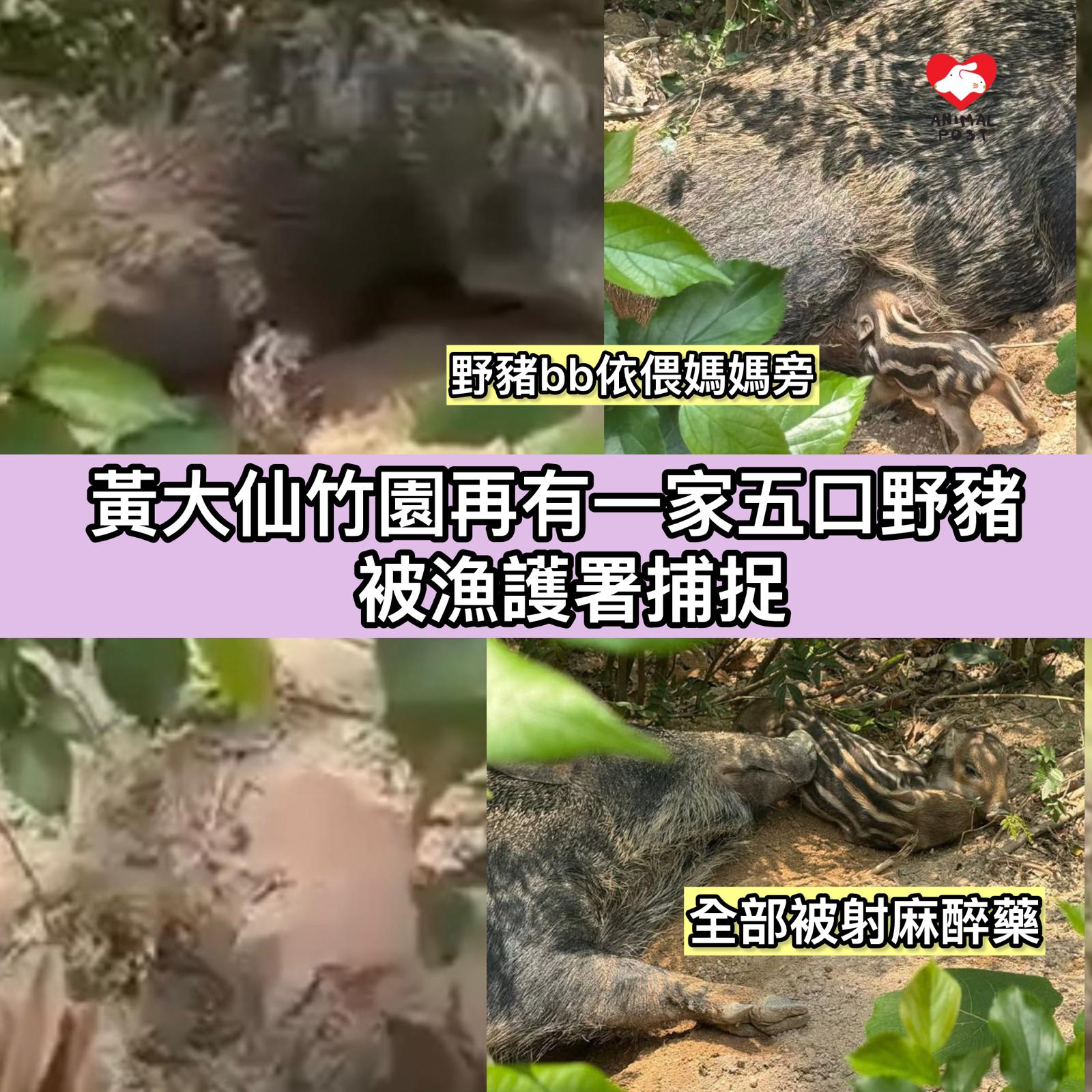 【動物突發】漁護署早前在黃大仙竹園北邨捕殺一家八口野豬,引來不少市民關注和反響,惟今日署方再於該邨捕捉了一家五口野豬,包括1大4小野豬,香港野豬關注組幹事Roni剛好在現場目擊捕捉過程,他引述在場漁護署職員表示,今次不是捕殺行動,一家五口野豬會野放到偏遠地區。漁護署其後發出新聞稿,表示評估公眾安全和動物福利等因素後,會將母豬及幼豬遷至遠離民居的偏遠郊野地點。Roni表示,希望漁護署不是單一次這樣做,而是尊重生命,改變捕殺政策。