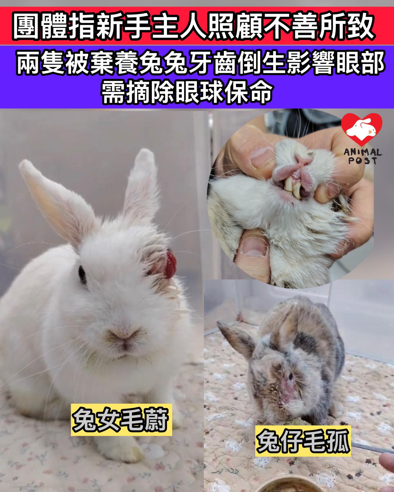 【動物專訊】飼養動物是一生一世的承諾,無論他的生、老、病、死,作為動物主人也應負責照料。惟無奈不少新手主人照顧不善,動物患病時卻選擇棄養,交由團體「善後」。香港救兔之家負責人Alex接連兩日收到兩隻兔兔的緊急求助,均因新手主人飼養不當,導致兔兔眼部凸出,需緊急接受摘除眼球手術保命。