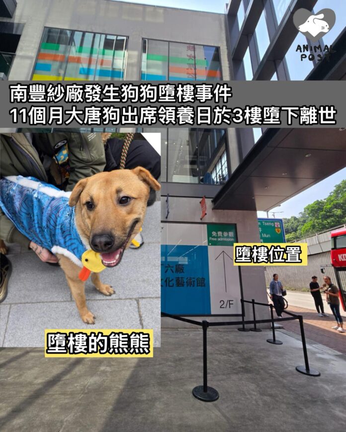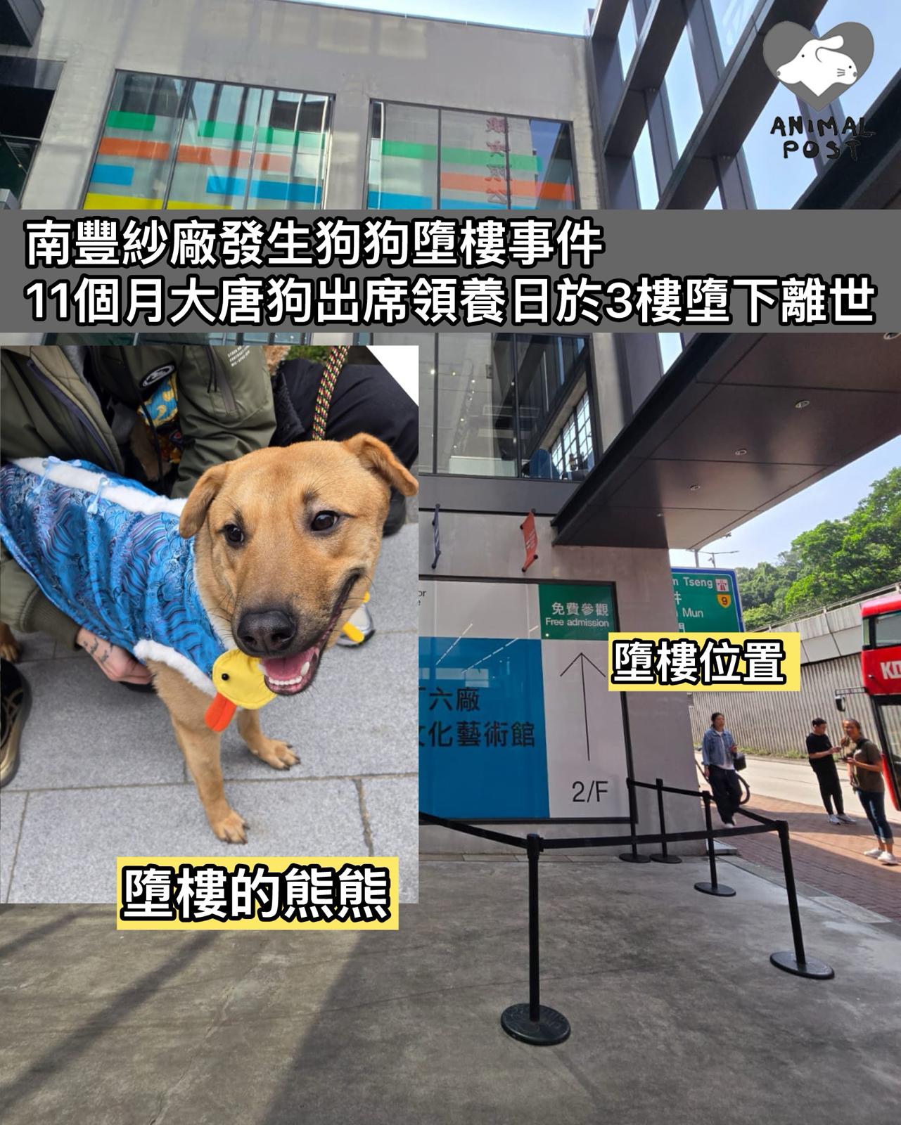 【動物突發】很多人帶狗遊玩的南豐紗廠,今日發生狗狗墮樓身亡嚴重事故。11個月大的唐狗「熊熊」今日出席領養日,於下午2時許突然從3樓狗公園墮樓,據知暫託人已帶熊熊到獸醫醫院,惟狗狗急救後不治身亡。該狗狗是由一名暫託人帶來,估計他帶了熊熊到3樓天台玩。在場義工Erica表示,該欄只有約107厘米高,狗狗很容易跳得過,照顧狗狗人士要小心之餘,亦希望南豐紗廠檢視有關設計是否安全。