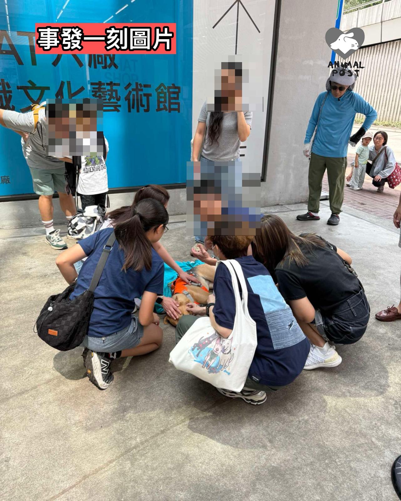 接着附近診所獸醫到場都不敢亂動狗狗,在場有義工們幫忙立即聯絡能收急症的診所,最後獸醫和圍着狗狗的義工與在場人士,幫忙移送狗狗到診所安置。她又表示,有從3樓天台下來的人士告訴她,指狗狗跳得很高,不小心跳了落去,而當時並沒有落繩。