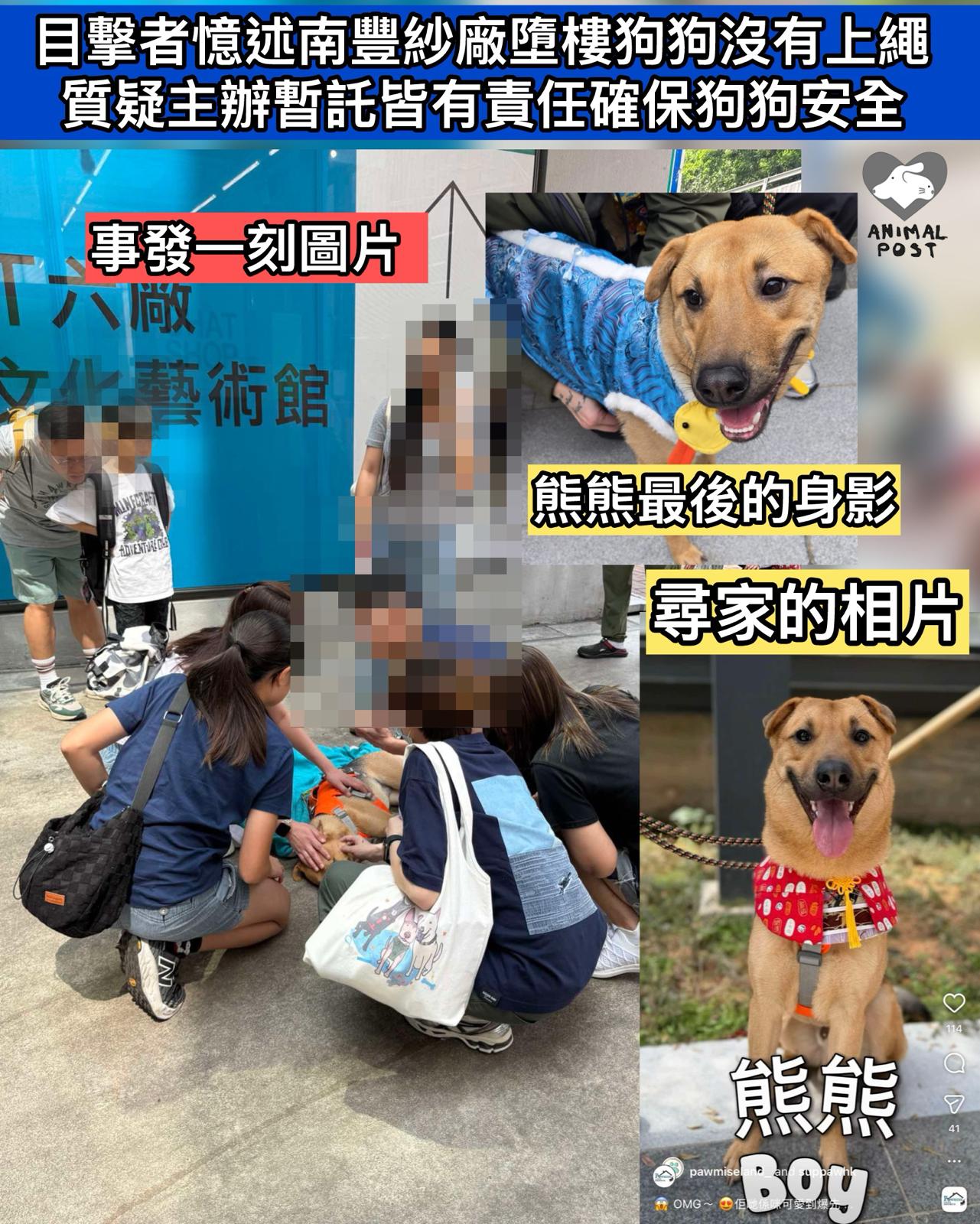 【動物專訊】許多狗狗均希望在領養日可以尋找到幸福的家,展開他們的第二狗生,年僅11個月大的熊熊也是其中一位,但他卻在今日南豐紗廠舉辦的領養日中,不幸於3樓天台墮樓死亡。南豐紗廠向來是狗狗聖地,該寵物樂園「汪汪大道Woof Avenue」更剛於4月22日開幕,詎料短短5日便發生意外。有目擊者向本報憶述事發一刻,聽到一聲巨響,狗狗便在她身後躺臥浴血,有流鼻血、胸口出血及失禁,當時有疑似是暫託人大聲問「而家點算好?」亦有市民告知當時狗狗沒有上繩,因為跳得很高而不小心墮樓。目擊者坦言對狗狗死亡感到非常好心痛,認為事件絕對可以避免。